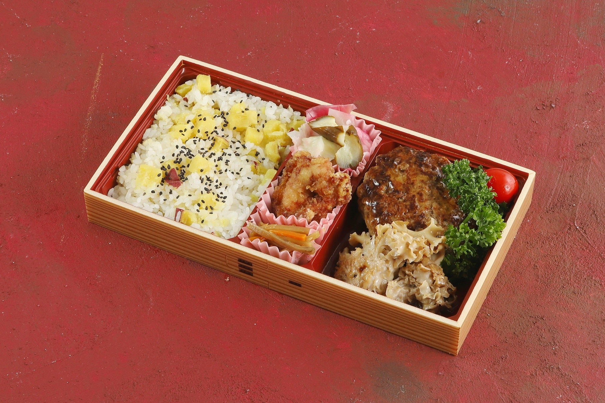 ほくほくのさつまいもごはんと群馬県産のはなびらたけ、和風生姜ソースのハンブルグステーキを一緒に味わえる、秋の味覚たっぷりのお弁当です。