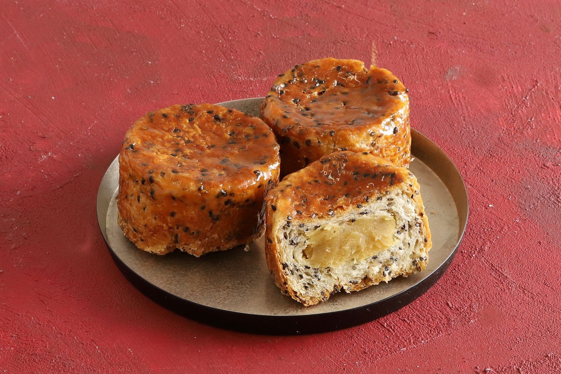 バター香る生地に芳ばしい胡麻を混ぜ焼き上げ、中には紅あずまを使用した優しい甘さのフィリングを包みました。