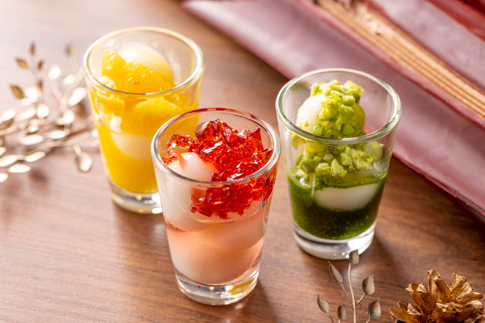 クリスマスカラーをイメージした3種類のソース(抹茶シロップと枝豆、ローズシロップとベリーゼリー、みかんのソースと果肉)で楽しめる、日本をイメージした白玉団子スイーツ。