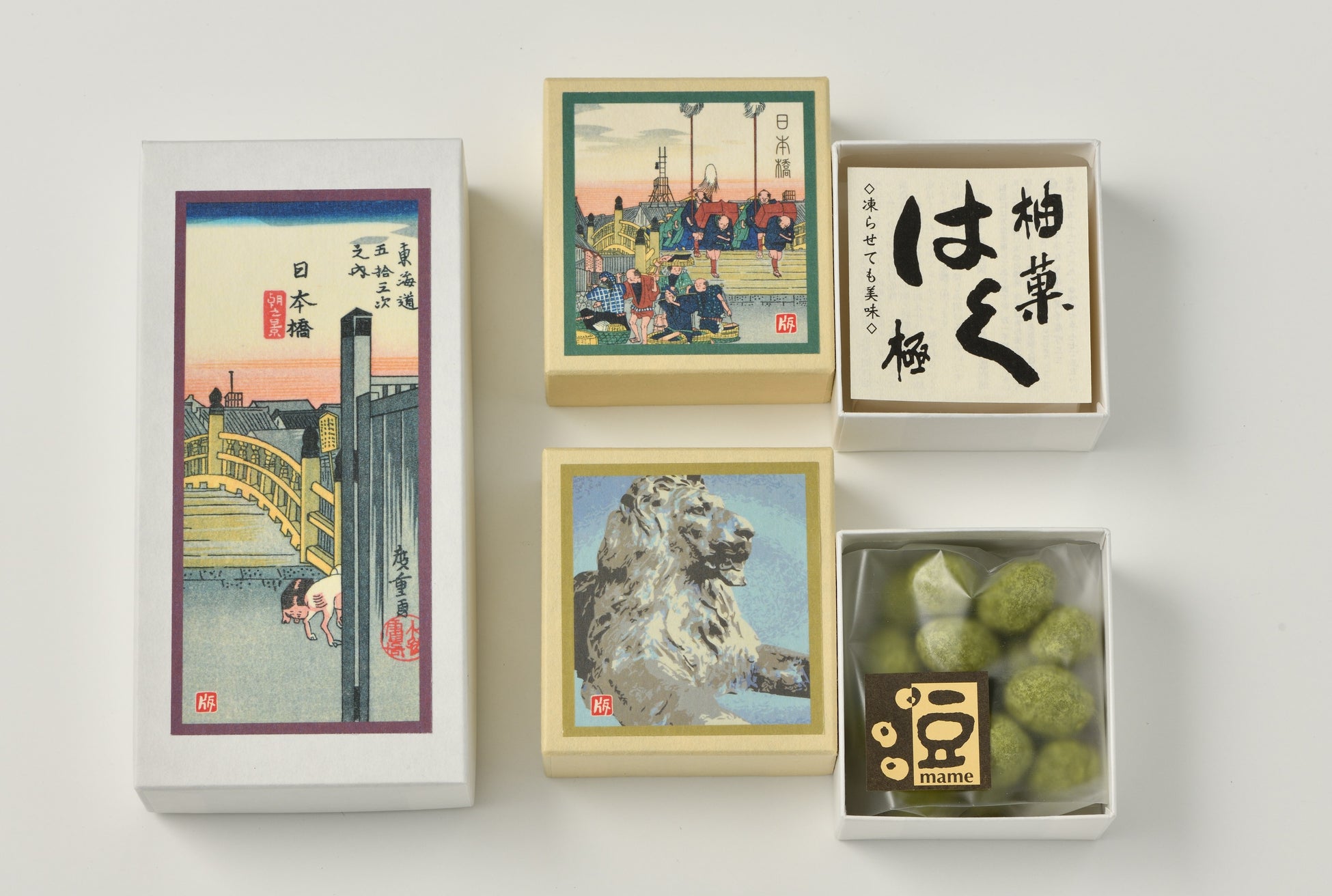 代々⻄本願寺、絵所を預かる家系からスタートした徳力家。⼗⼆代徳⼒富吉郎が残した数々の作品をオマージュし紙製品や⼯芸品、雑貨などを制作。今回は旧東海道の浮世絵をモチーフにした日本橋の風景、三越のライオン像を限定でセットにしたオリジナルおはこ2個セットをご提案。お年賀ギフトとしてもおすすめです。