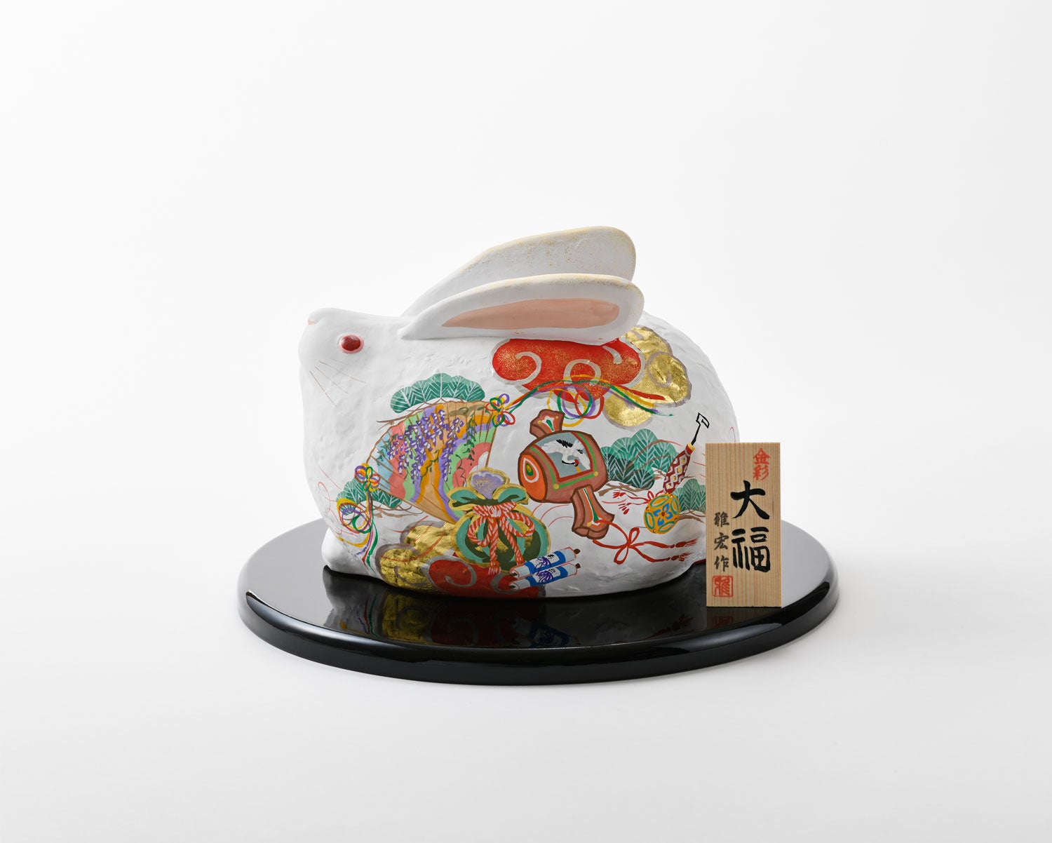 創業1959年、⼭科に⼯房を設⽴した京都小田益。遠く垂仁天皇の頃から続く素焼きの⼈形をルーツとした京陶⼈形を伝承。雛⼈形、五⽉⼈形、縁起物、⼲⽀⼈形を⼿描き⼿づくりで京都らしさを表現しています。古来より白いウサギは神聖な生き物で神様の使いと言われています。来年の干支、ふくよかな白い卯に寶尽くしの紋様を描いた、おめでたい干支人形をご用意しました。