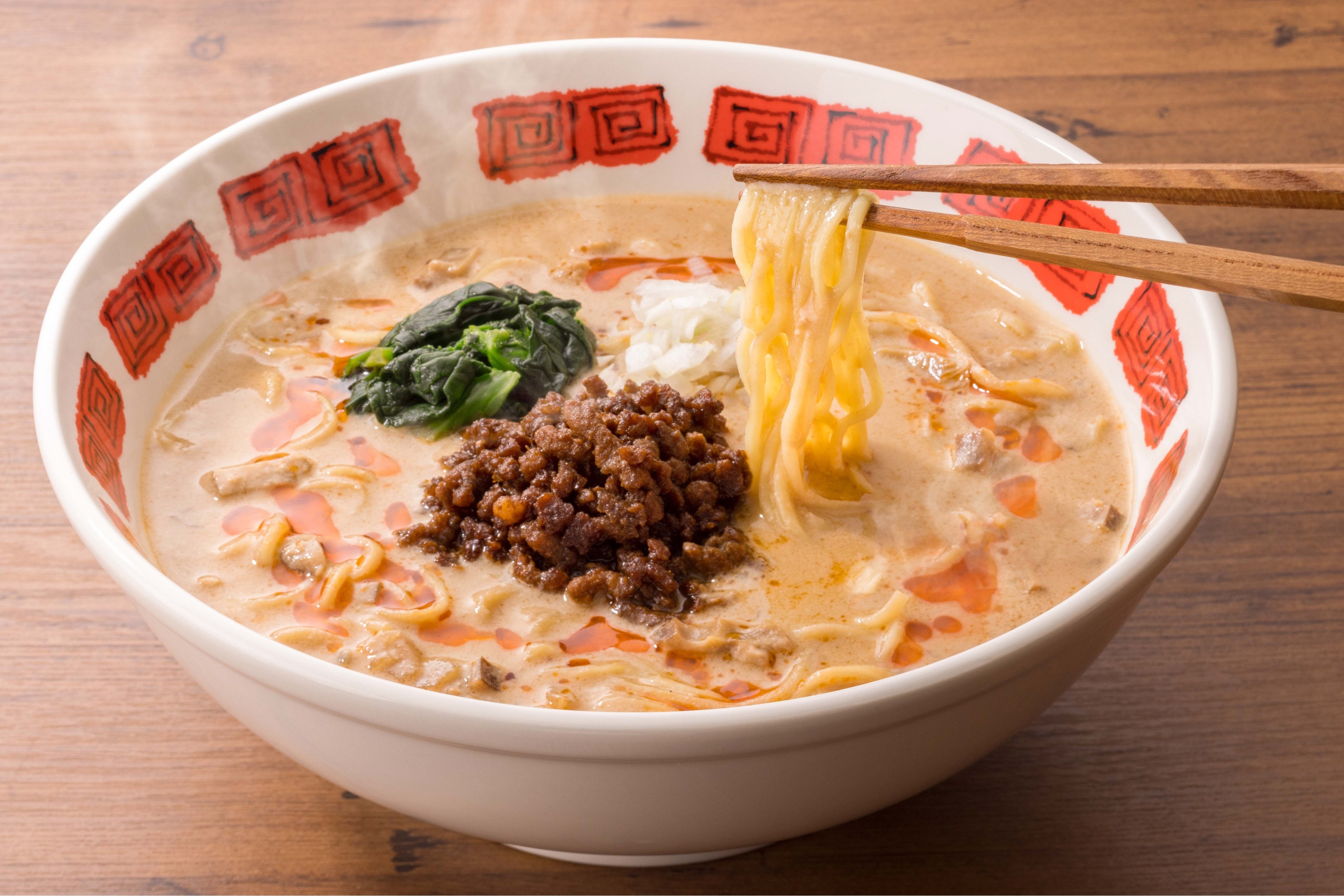 胡麻を挽いて香り豊かに仕上げた自家製の芝麻醤(チーマージャン)と、青山椒を粒からじっくり煮だして香りを移した香味油を使用し、本格的な担々麺に生まれ変わりました。お好みで花椒を入れてシビレやラー油の香りをお楽しみください。