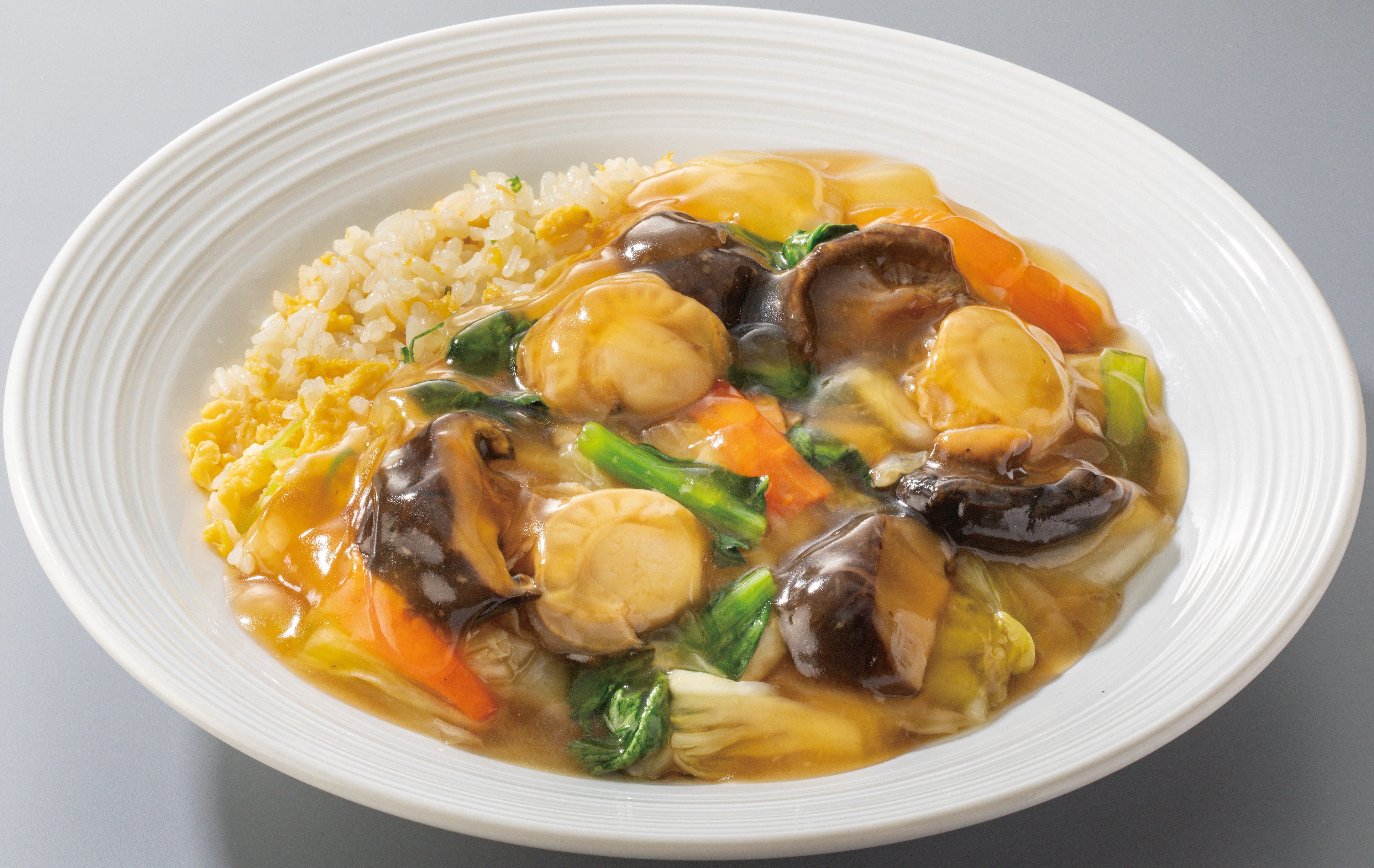 やさしい味付けのたまごチャーハンにかけた、椎茸と陸奥湾産帆立の旨味たっぷりのあんかけが絶妙なバランスを生み出します。