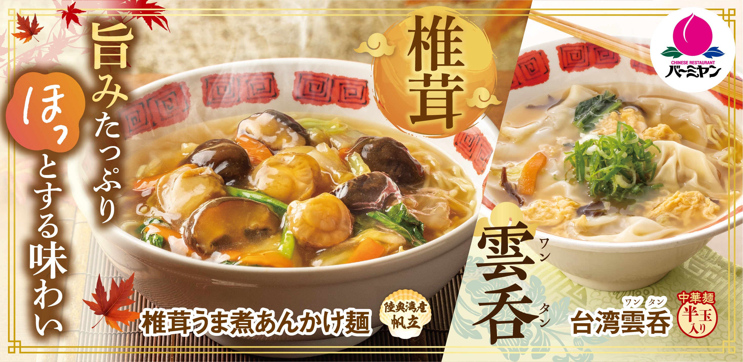 | 【バーミヤン「秋の新メニュー」 ポイント】 ①“秋の味覚”椎茸の出汁と旨みが凝縮した「椎茸うま煮あんかけ」メニューが登場 旨味たっぷりの熱々あんかけを、ラーメン・焼きそば・チャーハンからお好きな食べ方でお召し上がりください。 ②【バーミヤンの新定番!?】“自家製雲呑(ワンタン)”を使用した本場台湾を感じる新メニュー |