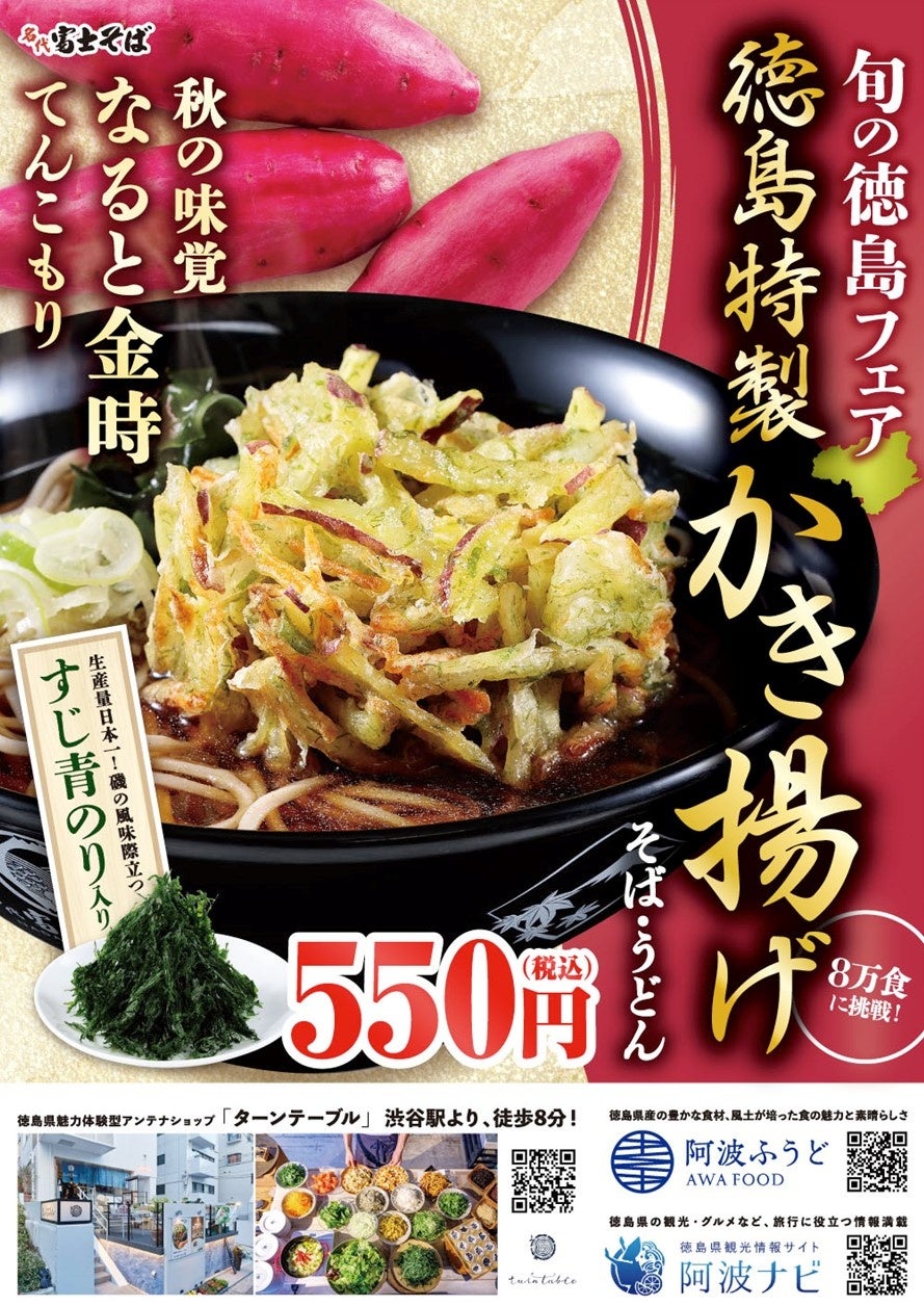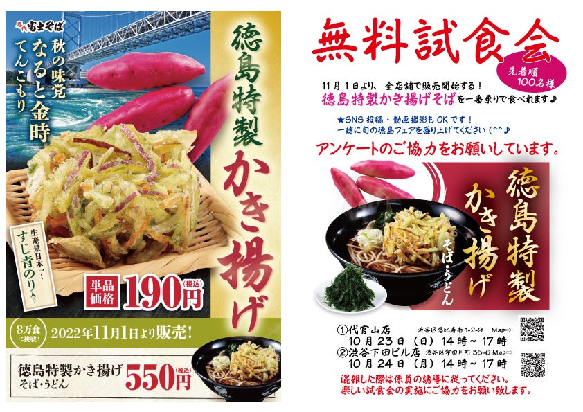 徳島特製かき揚げの販売記念として、先着順で一般の方へ合計200名様、メディア関係者様に向けて無料試食会を実施します。いち早く、秋の新作「徳島特製かき揚げ」を体験してもらい、渋谷から、徳島県の魅力を発信します。試食会に参加してくださる方にはアンケートお願いしています。