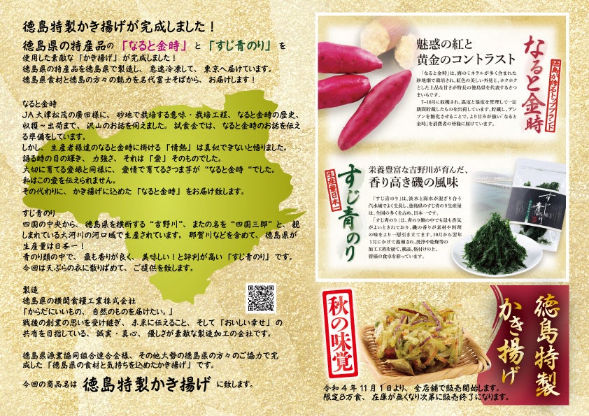 徳島県の特産品「なると金時」(さつま芋)と「すじ青のり」(生産量日本一)を使用したかき揚げを開発しました。製造も徳島県の企業(横関食糧工業株式会社)で行っております。