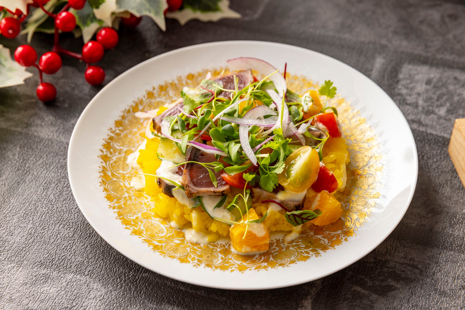 日本の郷土料理「手捏ね寿司」を洋風にアレンジ。漬けカツオとたっぷりの野菜をサフラン風味の酢飯にトッピングした、サラダ感覚で食べられる一品。