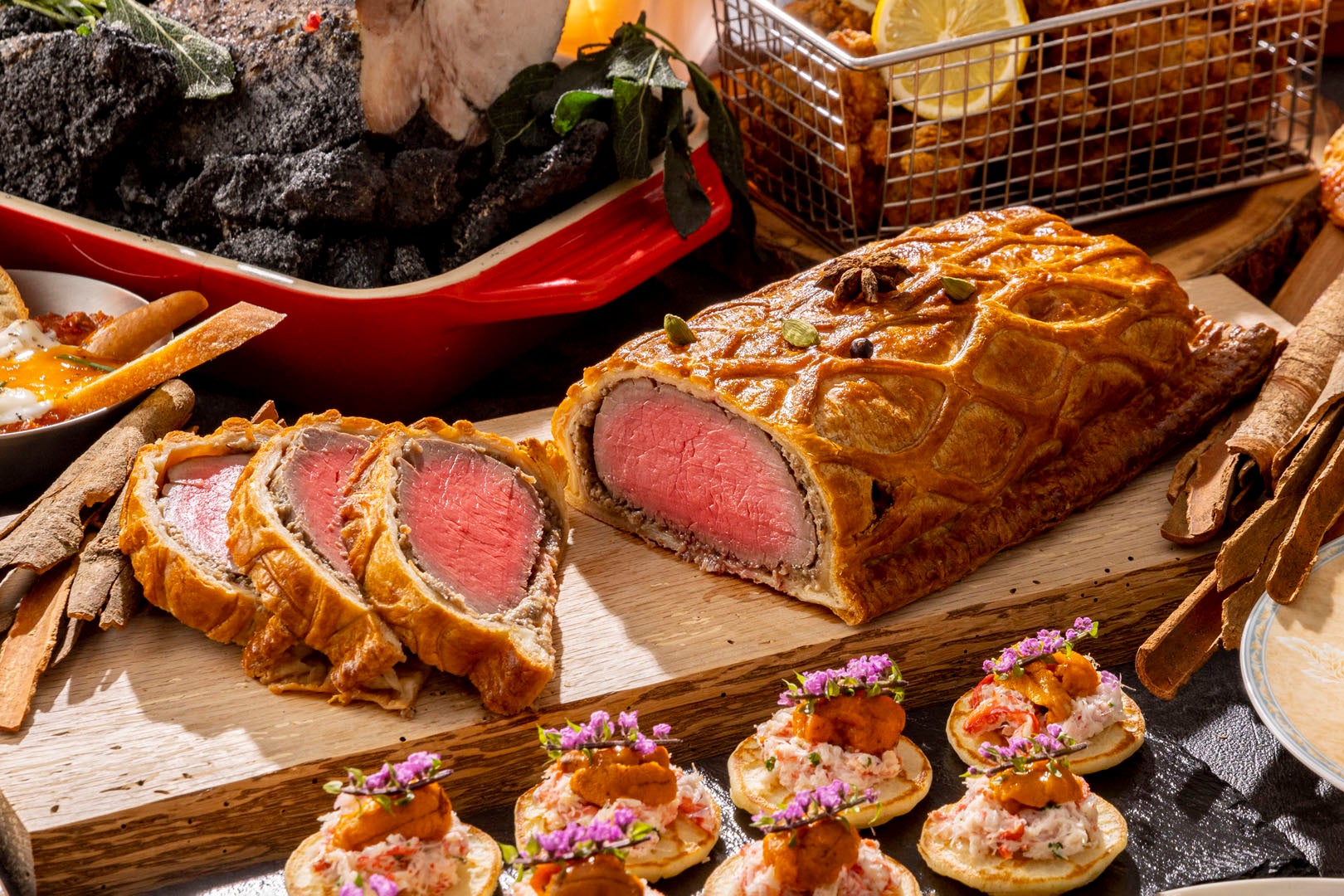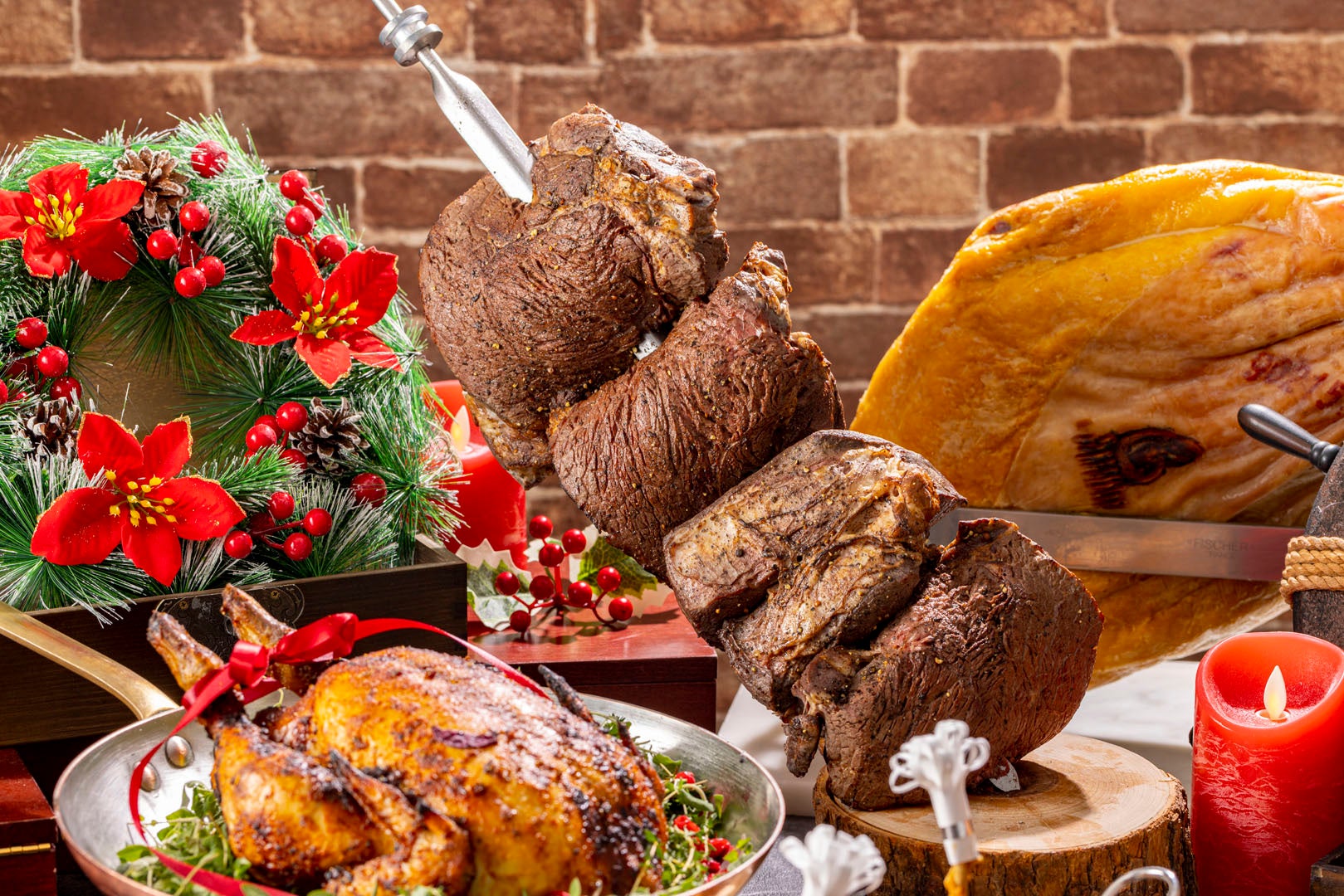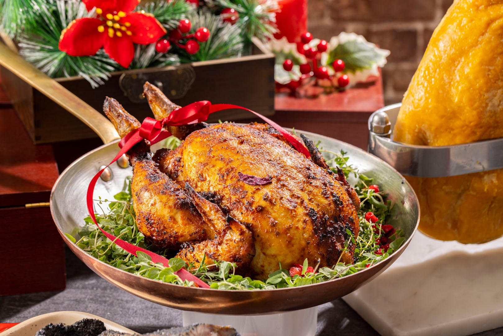漬けカツオと旬の野菜をサフラン風味の洋風酢飯と一緒にお召し上がりいただく日本の漁師料理「鰹サフラン手捏ね寿司」、ヒルトン名古屋オリジナルのカシューナッツカレーペーストが脂ののった鯖とたっぷり野菜にベストマッチしたトルコの「鯖サンド」、パイの器に入ったエビとマッシュルームの濃厚なクリームのコラボレーションが絶妙なフランスの伝統料理「ヴォロヴァン」、ケッパーがアクセントのクリーミーなトマトソースをまとった銀鮭を半身丸ごと豪快に焼き上げる「クリーミートスカーナ風サーモン」、ジャスミンライスと相性抜群の鰹の旨味とスパイスが混ざり合った「モルディブ風マスリハ(鰹のココナッツミルクカレー)」など約10カ国のメニューをご用意しました。クリスマス定番グルメのローストチキンは、丸鶏を蜂蜜や様々な香辛料に漬け込み、オーブンでじっくりとジューシーで香ばしく、スパイシーに焼き上げました。また、柔らかなアンガス牛ランプ肉を長い串に刺して豪快にじっくりと焼き上げた「ビーフシュラスコ」は、目の前でシェフがお好きなだけカットしてご提供します。お好みに合わせて3種類のソース(レフォールクリーム・ハリッサディップ・チミチュリソース)でお召し上がりいただけます。