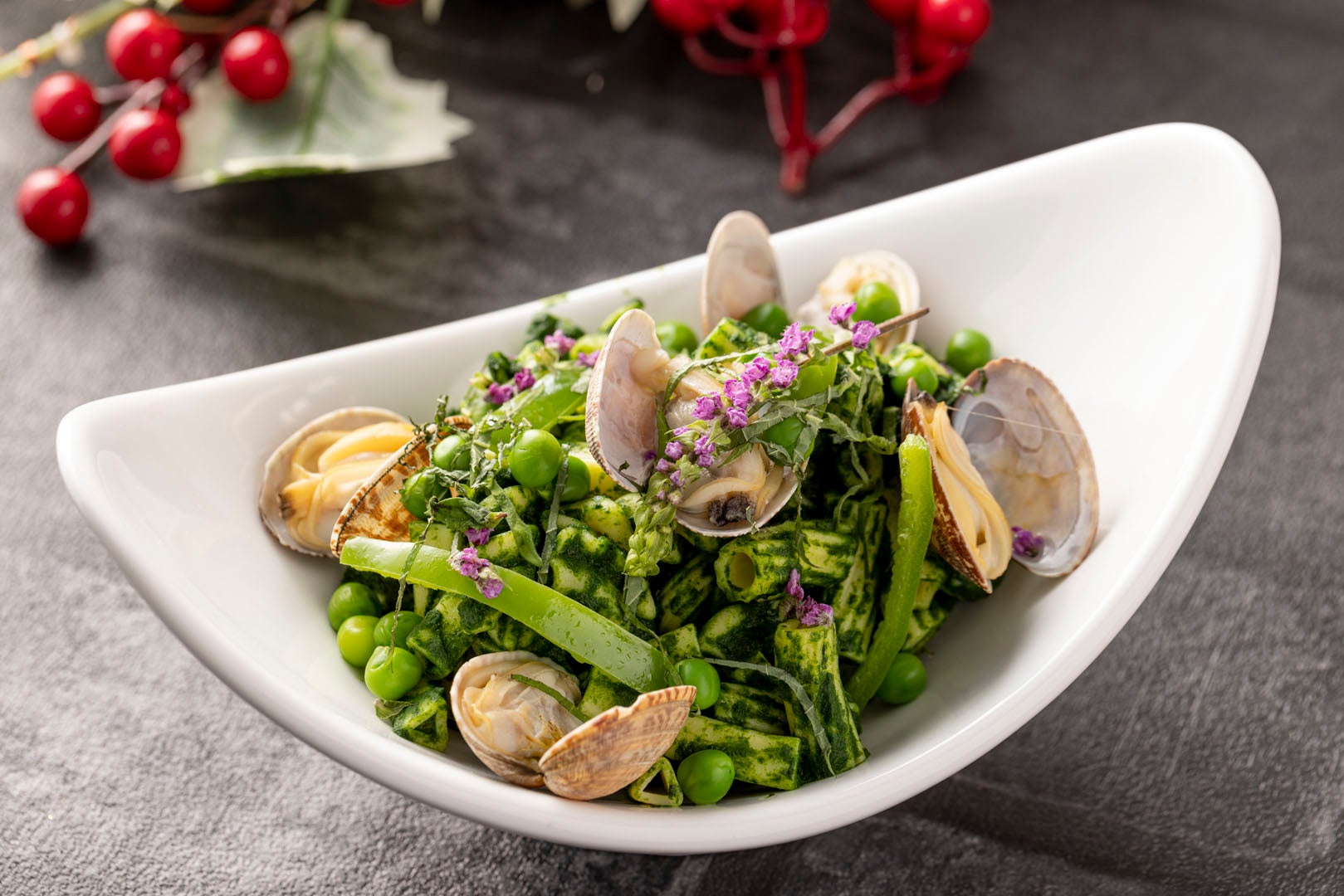 ペースト状にした大葉や緑野菜をふんだんに使いベルデ(緑)に仕上げたソースに、6種類のパスタを絡めたボンゴレパスタ。アクセントに花穂紫蘇をトッピング。