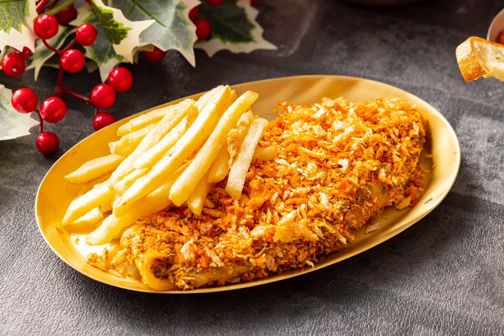 イギリスの王道料理「フィッシュアンドチップス」。スパイスやハーブの効いたパン粉を魚に纏わせ、オーブンでサクサクに焼き上げました。柴漬けの入ったタルタルソースとモルトビネガーをお好みで。