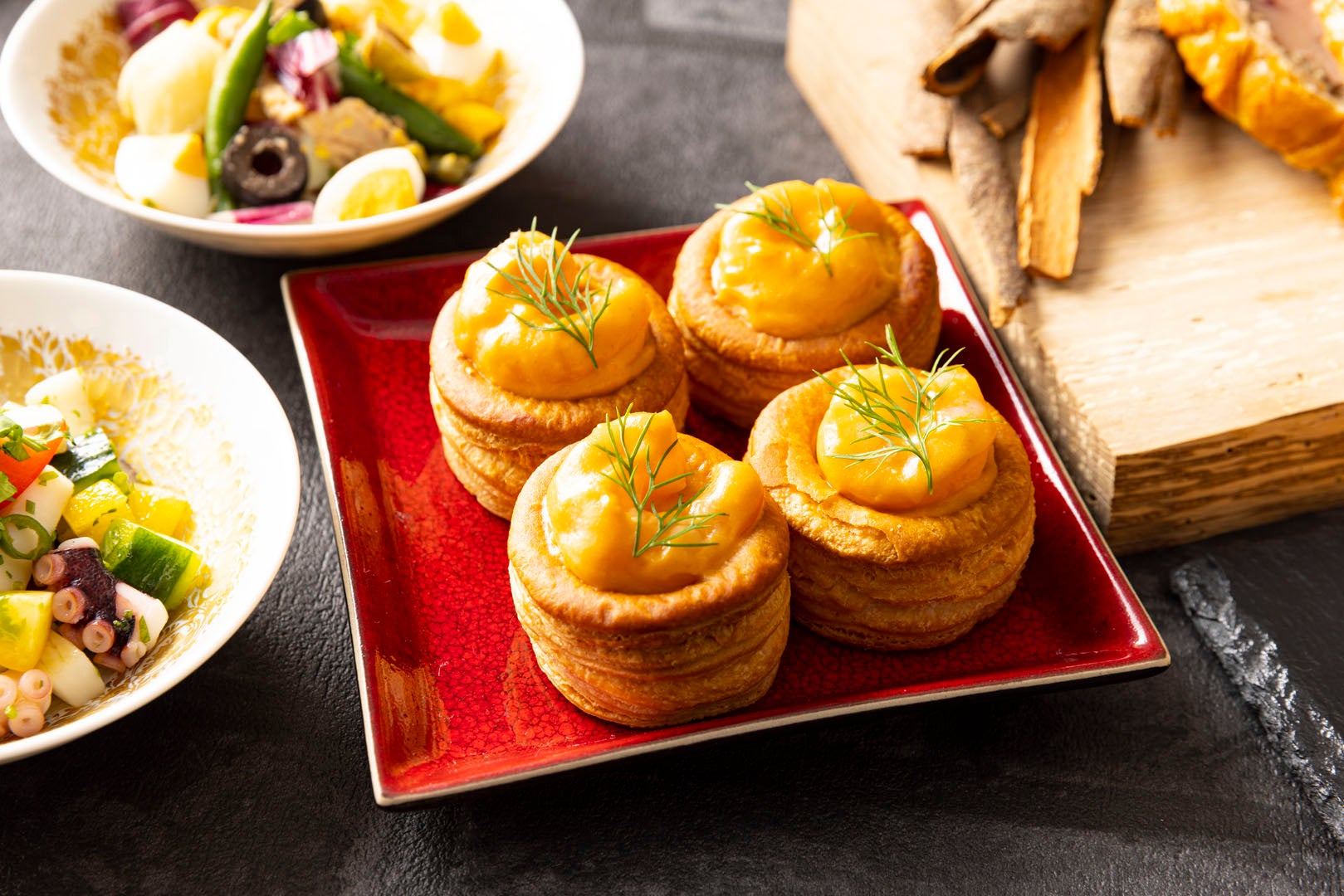 エビとマッシュルームのクリームソースを一口サイズのパイ生地の器(ヴォロヴァン)に詰めて。