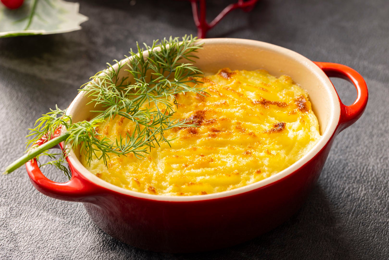 ラム肉を使用したアイルランド発祥のシェパーズパイをシーフードでアレンジ。下はホワイトソースと絡めたシーフードやパスタや野菜、上にはクリーミーなマッシュポテトの2層仕立てにしてこんがり焼き上げました。