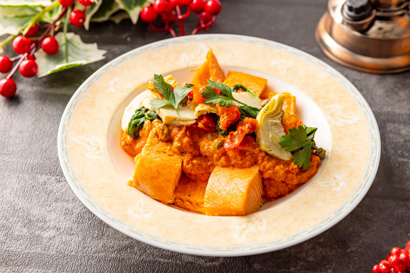 銀鮭を半身丸ごと豪快に焼き上げ、クリーミーなトマトソースにケッパーをアクセントで加えて全体をコーティング。クリームのマイルドさに程よい酸味が効いて絶妙な味わいに。