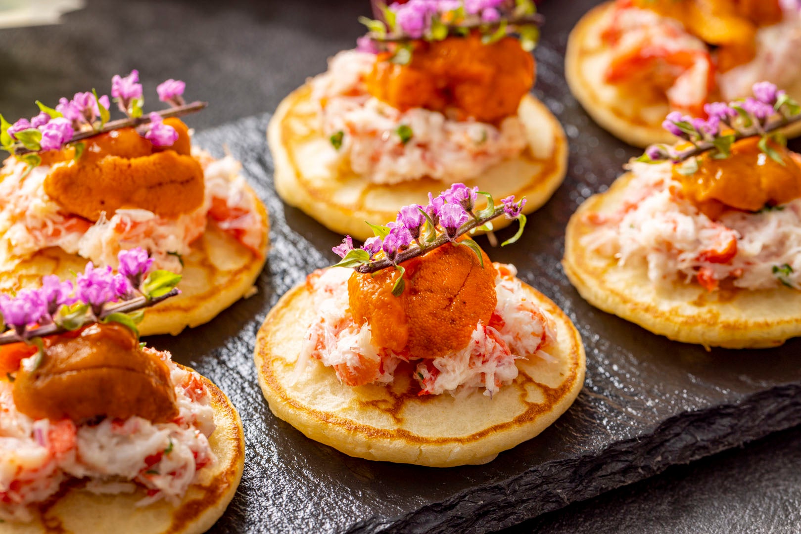 紅ずわい蟹と雲丹をロシアのパンケーキ「ブリニ」に添えて、海の幸が口いっぱいに広がる一品。