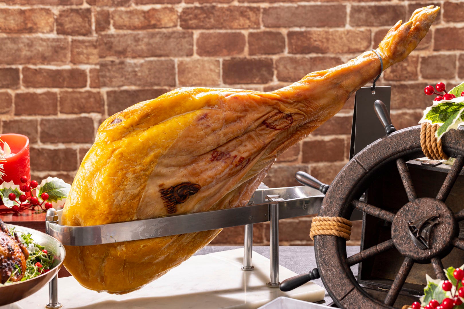スペインの極上生ハム ハモンセラーノグランレゼルバの原木を大胆にカッティングサービスにて提供。