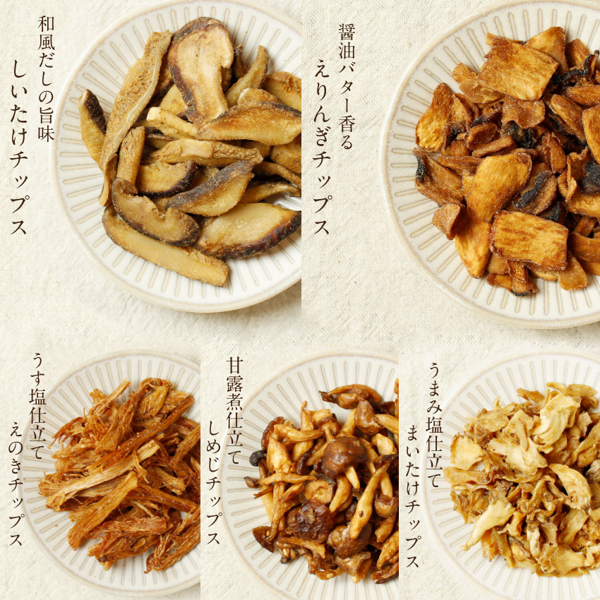 内容量:しいたけチップス 40g/まいたけチップス 35g/しめじチップス 30g/えりんぎチップス 30g/えのきチップス 30g