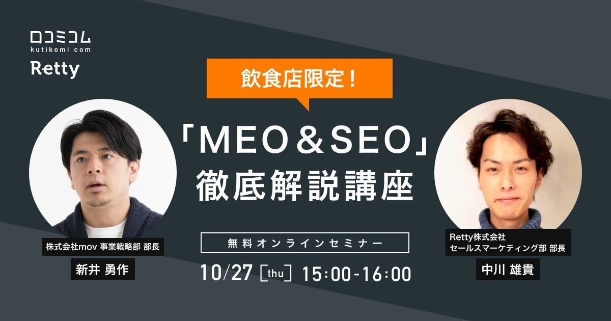 実名口コミグルメサービス「Retty」を運営するRetty株式会社(本社:東京都港区、代表取締役:武田 和也、以下Retty)は、口コミコムを運営する株式会社mov(以下mov)と共催で、飲食店向けWebセミナー「飲食店限定「MEO & SEO」徹底解説講座」を10月27日(木)15:00〜16:00で開催します。Rettyは飲食店のみなさまがよりよい集客を実現し、Happyな食体験を生み続けられるようサポートしてまいります。