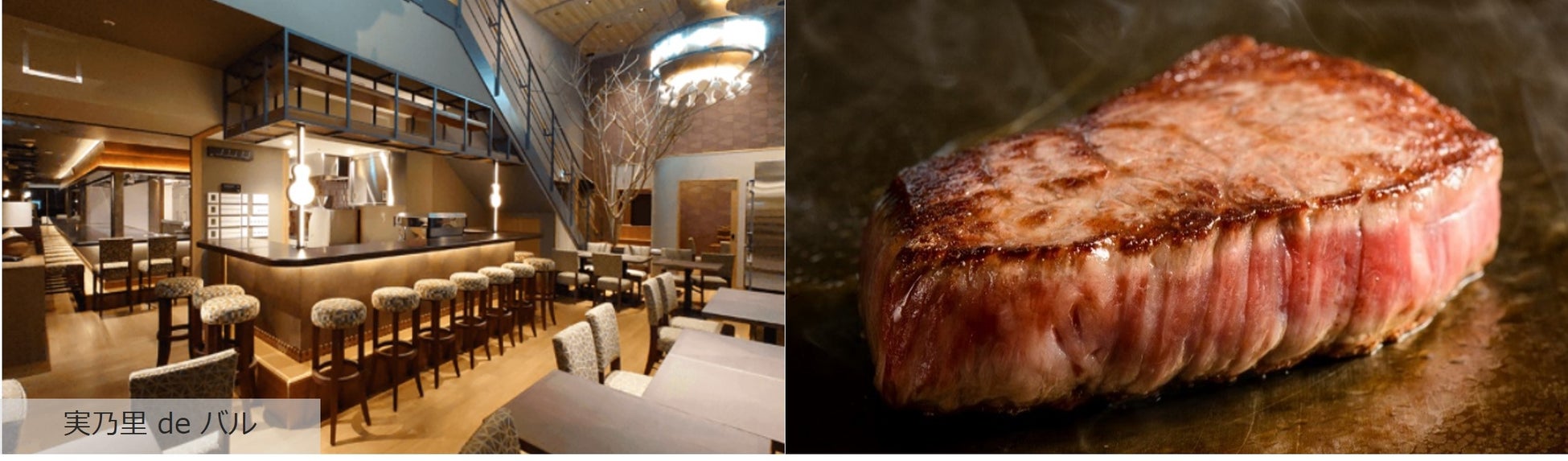 「実乃里 de バル」のディナーでは、A5ランク黒毛和牛ステーキを職人が丁寧に焼き上げます。1階には鉄板前のカウンター席やテーブル席、落ち着いた個室をご用意。2階にはテーブル席が並び、ゆったりとお寛ぎいただけます。