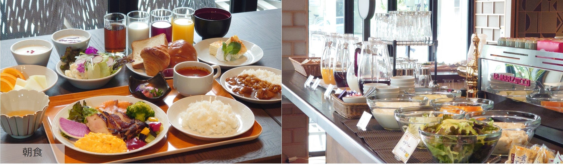 朝食は、和食・洋食からお好みでお選びいただけるプレートに加え、パンや新鮮な野菜を使ったサラダなどブッフェ形式のメニューも取り揃えています。午前7時からご利用いただけるため、ビジネス利用の方にもおすすめです。