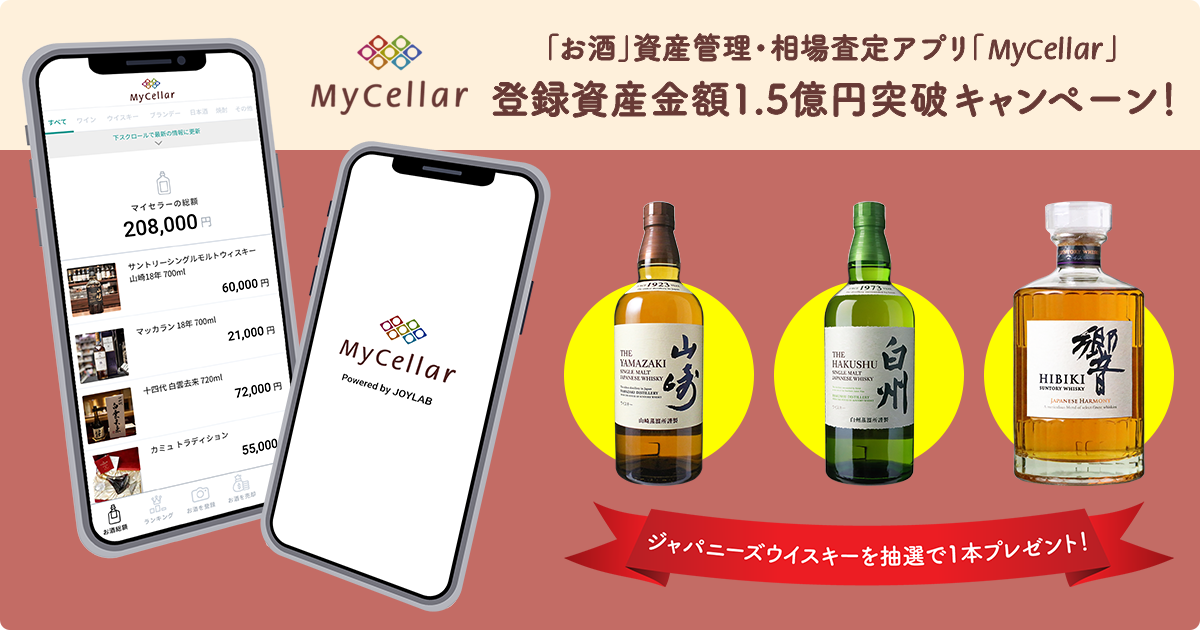 BEENOS株式会社(東証プライム 3328)の連結子会社で、酒類の買取・EC 販売を行う JOYLAB 株式会社(本社:大阪府大阪市、代表取締役社長:太田圭亮、以下:JOYLAB)が運営するお酒の資産管理・査定相場情報アプリ『MyCellar(マイセラー)』への登録資産金額が2022年8月に1.5億円を突破いたしました。ご利用いただいている多くの皆さまへの感謝を込め、『MyCeller』登録ユーザーから抽選で3名様に、山崎NV・白洲NV・響JHをプレゼントするキャンペーンを開催いたします。