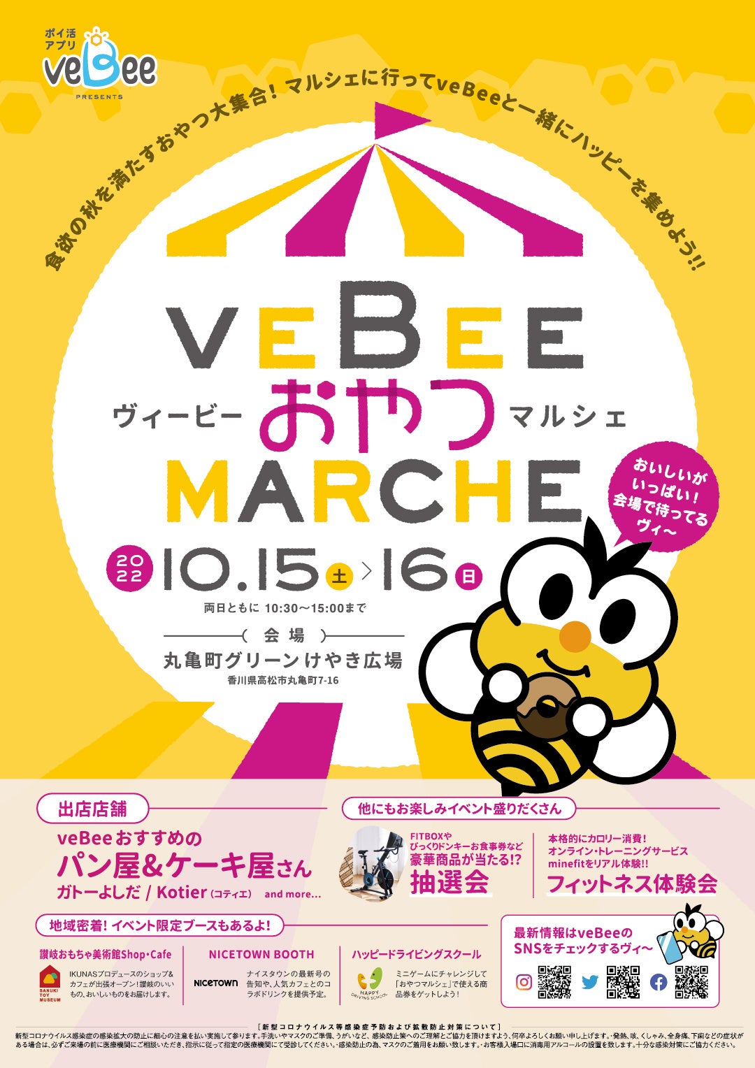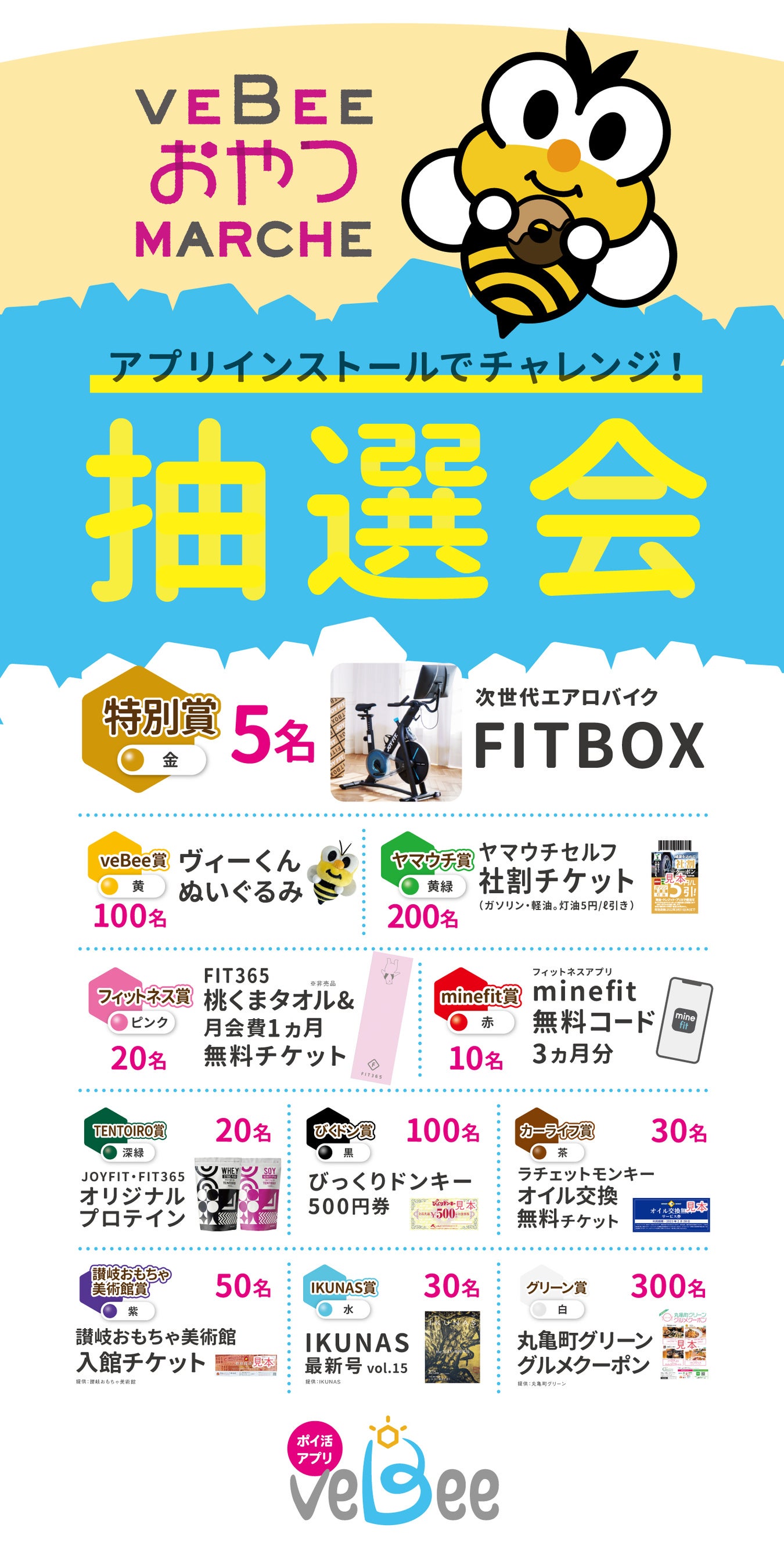 県内の人気のパン屋やスイーツ店を集めたおやつマルシェを開催します。地域密着ブースではNICE TOWNから人気店とのコラボスイーツや、讃岐おもちゃ美術館shop&cafeも登場。veBeeアプリユーザーの方全員に、フィットネスバイクFIT BOXやかわいいヴィーくんぬいぐるみなど素敵な商品が当たる、ハズレなしの抽選券もプレゼント!