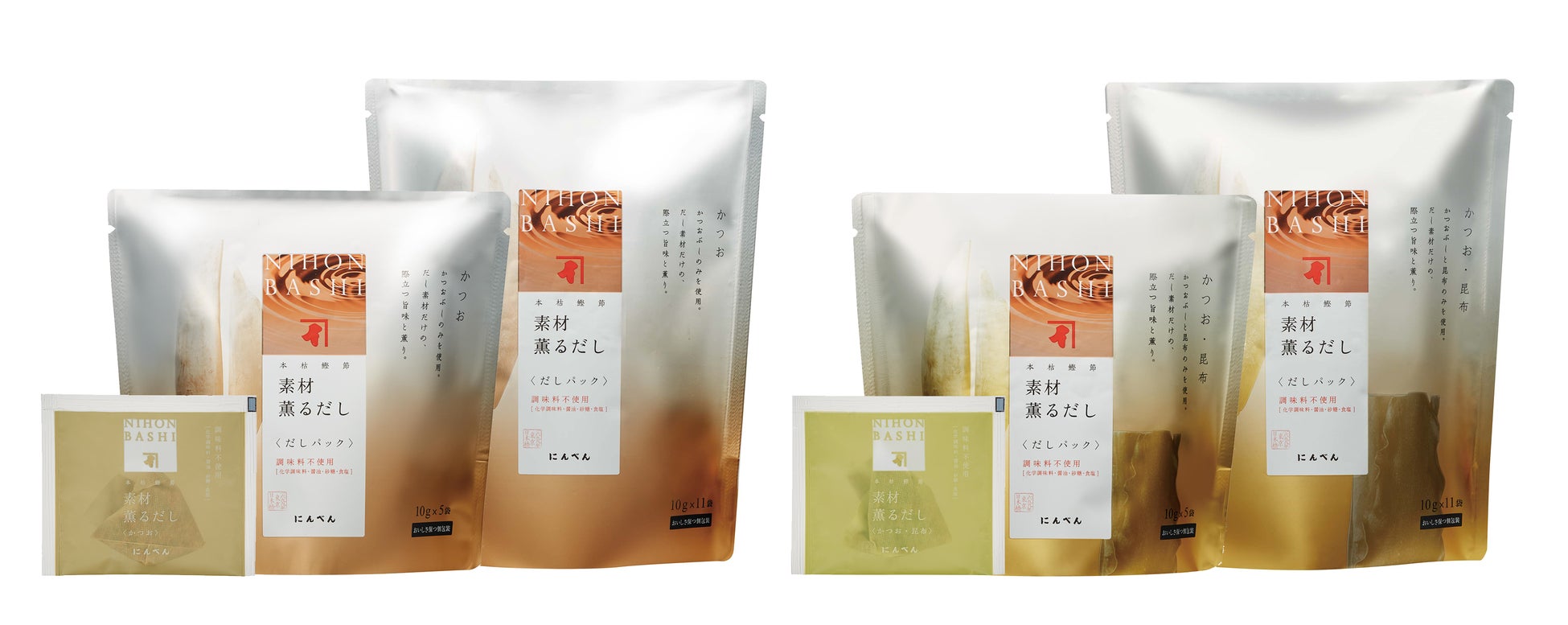 ひきたてのだし本来の香りと味わいを楽しんでいただける調味済だしパックです。素材になるべく熱をかけず、“かつお節の香りをとばさない“乾燥法により、だしをひいた時に漂う「ほっとするような、かつお節本来の優しい香り」を極めました。一つ一つ不活性ガス充てんをした個包装は、酸化を抑え、使う瞬間まで風味を保ちます。国内製造の“本枯鰹節“、芳醇な香りとうま味が楽しめるプレミアム醤油“特選下総醤油“、だしとの相性がとてもよい“クリスマス島の塩“、「かつおと昆布」には北海道産“真昆布“、「焼あご入り」には国内製造の“焼あご“を使用し、シンプルに素材の美味しさを追求しました。化学調味料無添加です。