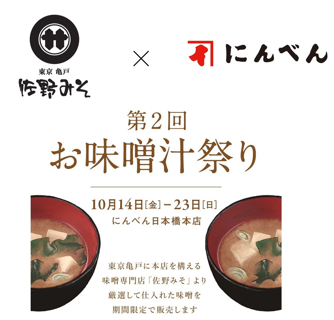 株式会社にんべん(東京都中央区、代表取締役社長 髙津伊兵衛)は、東京・亀戸に本店を構える味噌専門店「佐野みそ」との共同企画「第2回お味噌汁祭り」を、COREDO室町1の「にんべん 日本橋本店」にて、10月14日(金)から10月23日(日)の期間で開催いたします。