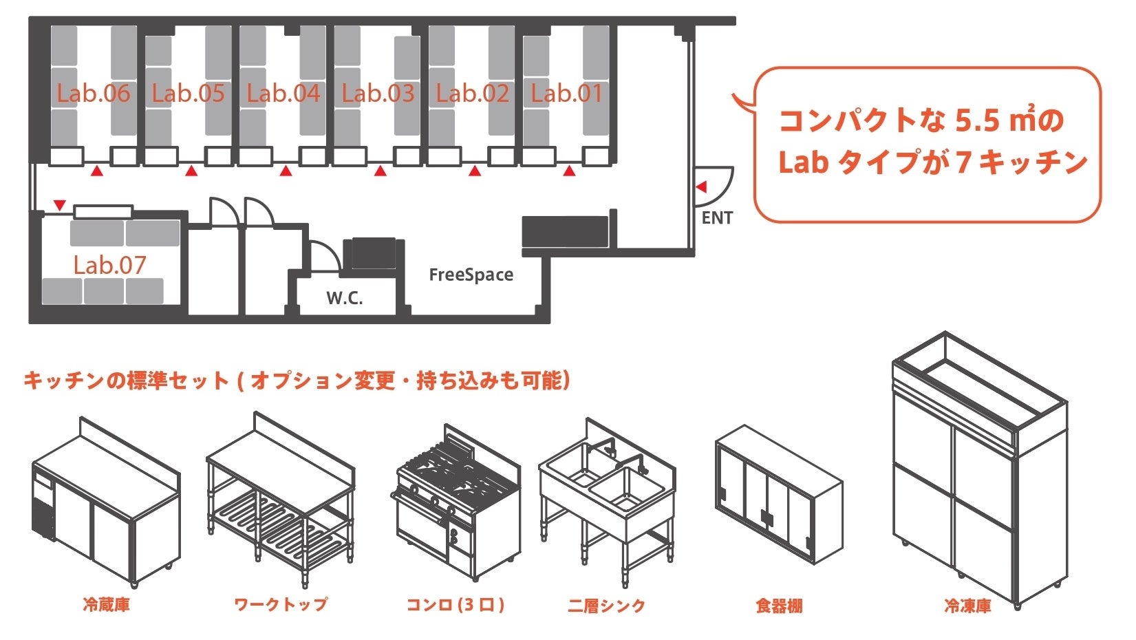 当店にはデリバリー/テイクアウト営業のために必要な設備が揃った専用できるキッチンを7ブースご用意しています。初期費用99,800円から入居が可能で、月額利用料等をお支払いいただくことで利用が可能です。当店を利用することで開業にかかる改装費用や工事期間を短縮し、最短1ヶ月で営業開始できます。