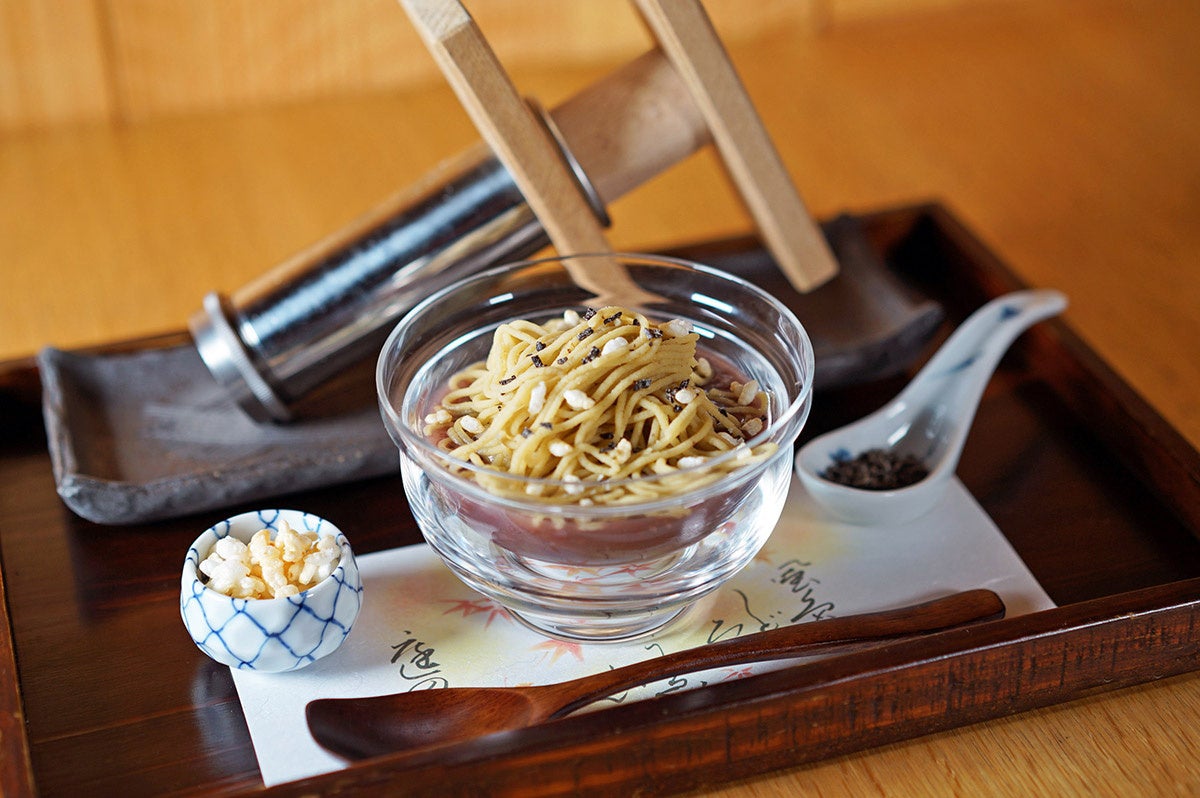 ■できたて0秒、和栗のおしるこモンブラン~熊本県産和栗と北海道産小豆のマッチング~:北海道産の小豆の上品な甘さのおしるこに、熊本県産の和栗をていねいに裏ごしして仕上げたモンブランクリームを、ご自身で絞ってできたてをお召し上がりいただきます。
