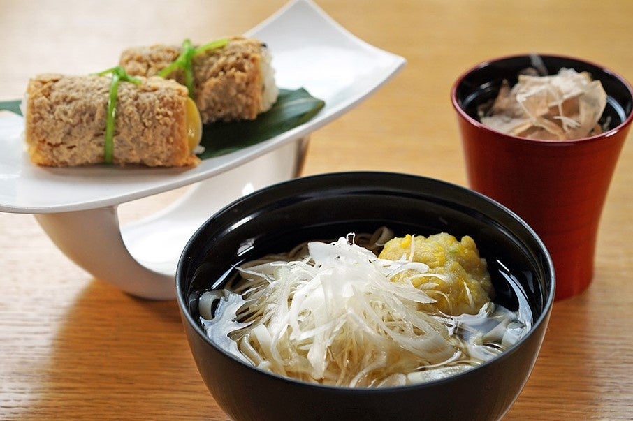 ■一口湯葉丼イクラ乗せ:湯葉と出汁の優しい美味しさが広がります。