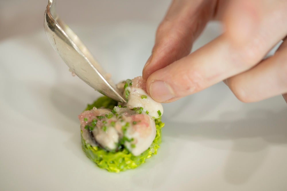 付け合わせ:フィンガーライム、みじん切りのエシャロット、安んだチャイプ、刻んだポリジの花、スイバ