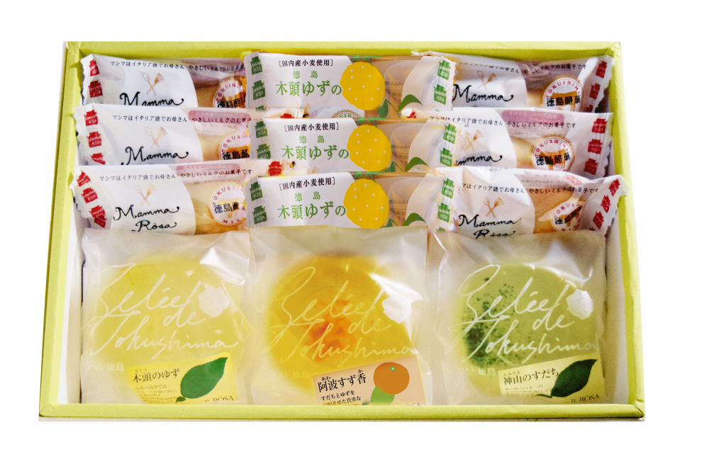 商品内容:徳島柑橘ジュレ3種とマンマローザの詰合せ(木頭ゆずのジュレ・阿波すず香のジュレ・神山のジュレ 各1個 マンマローザミルク6個、木頭ゆずのマンマローザ3個)