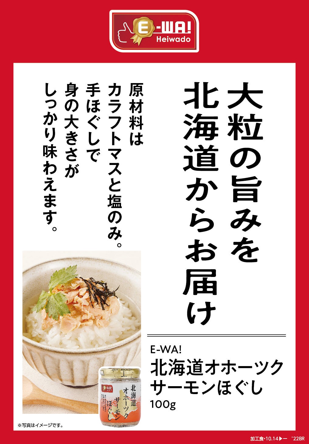 株式会社平和堂(本社:滋賀県彦根市、代表取締役社長執行役員:平松正嗣)は、平和堂こだわりブランドE-WA!の新商品として、「北海道オホーツクサーモンほぐし」を、2022年10月15日(土)より平和堂・エールの158店舗で新発売いたします。