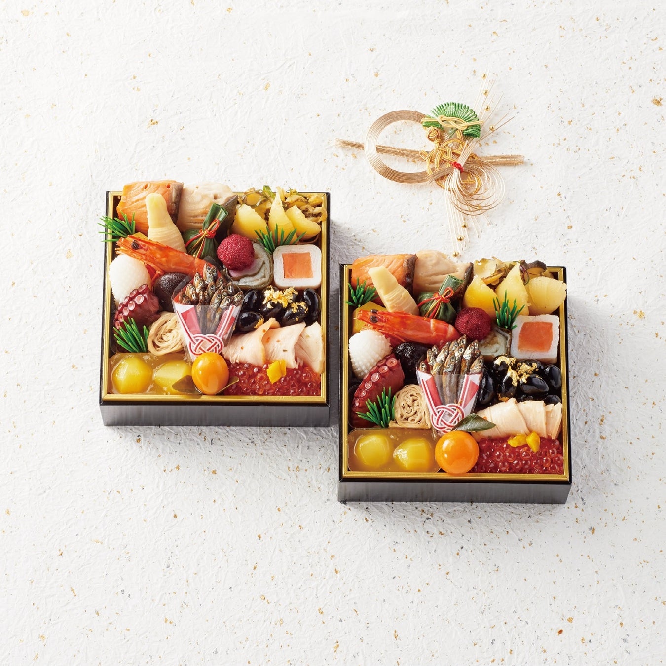 おおよそ25.7㎝四方の大きなお重に、料理人が吟味した食材の数々を、彩り良く豪華に盛り付けました。口取りから甘味に至るまで、61品全てに味付けの妙と素材の力を活かしておりますので、老若男女問わず、重箱の隅までお楽しみいただけます。