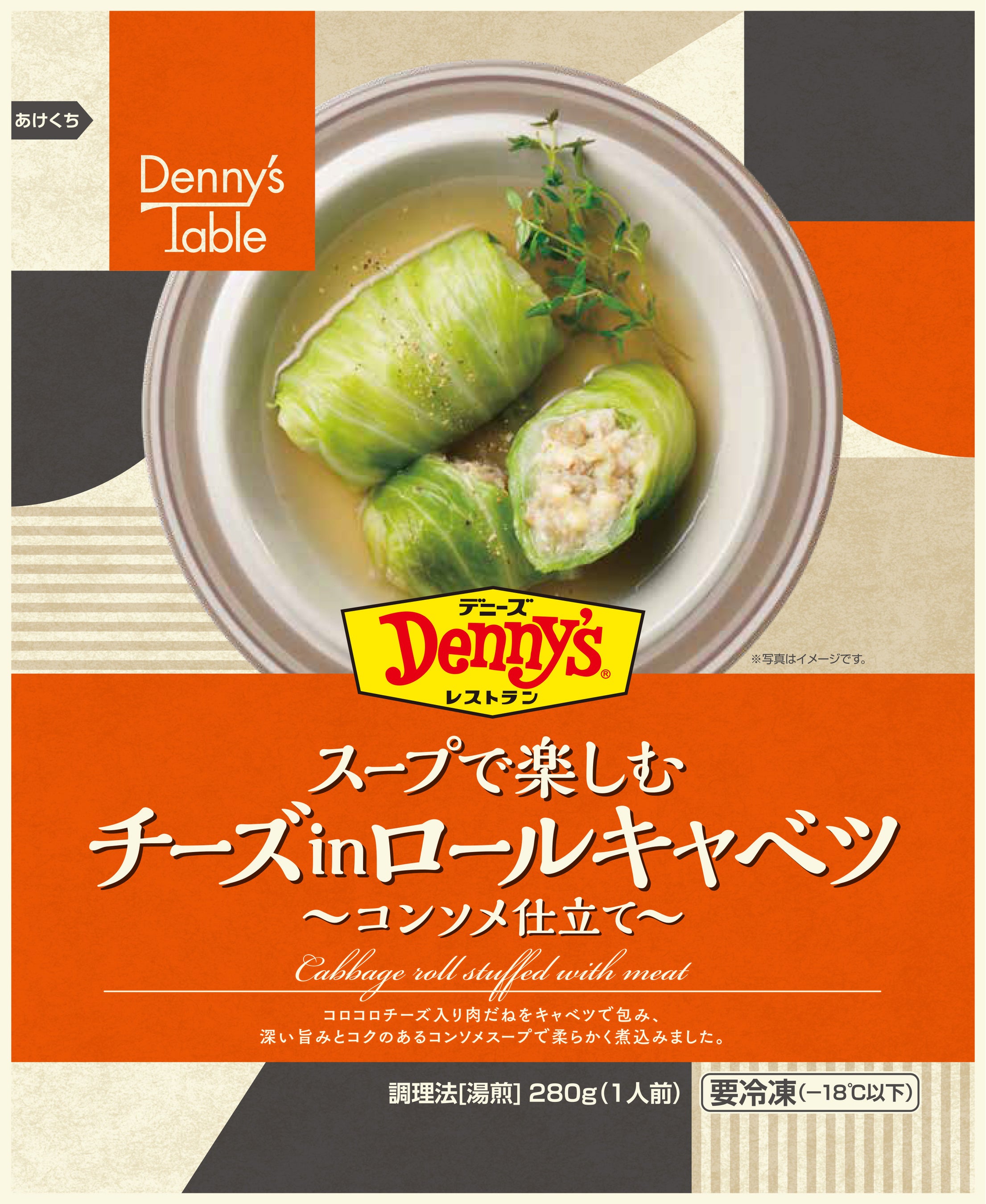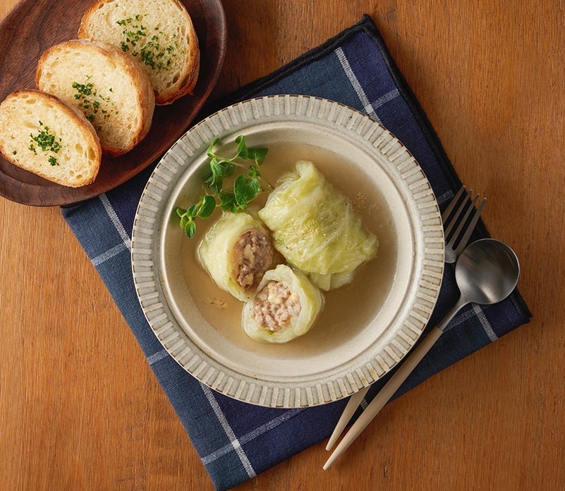 コロコロチーズ入り肉だねをキャベツで包み、深いうまみとコクのあるコンソメスープで柔らかく煮込みました。