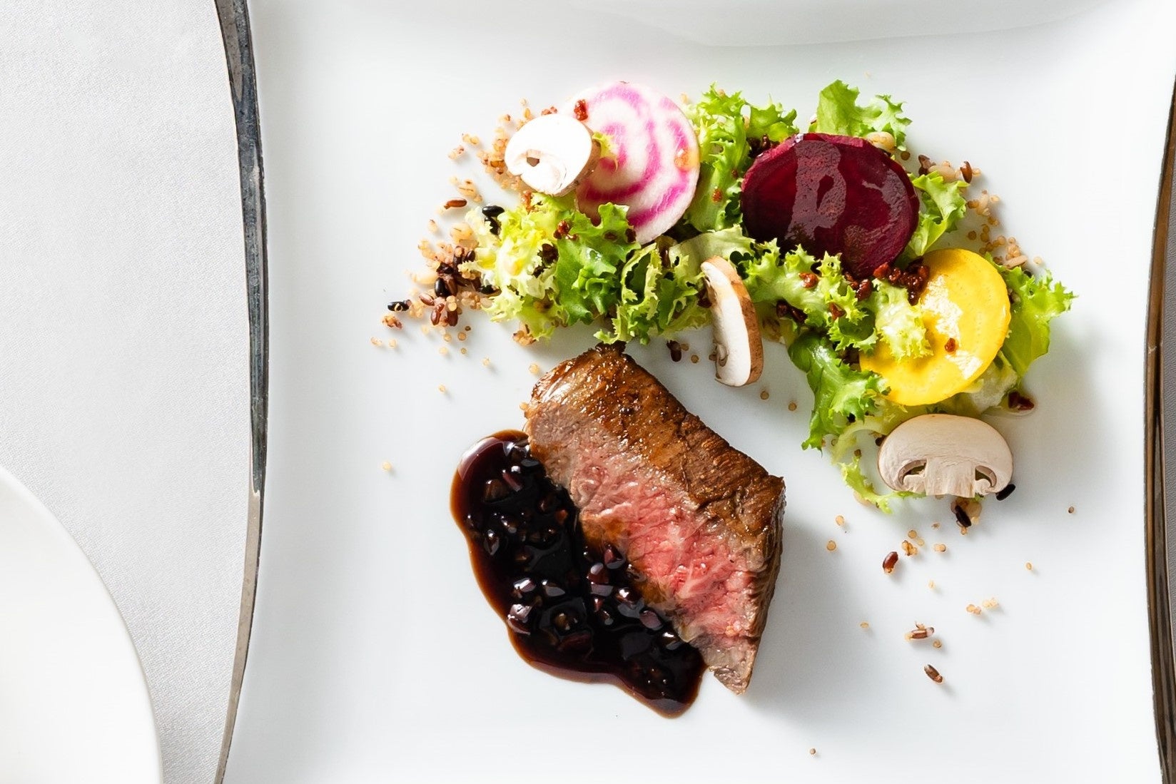 牛フィレ肉のローストし、周りには色鮮やかな周辺地域で収穫された新鮮な野菜を添えています。ソースは少し甘めのマデラワインでご用意しています。