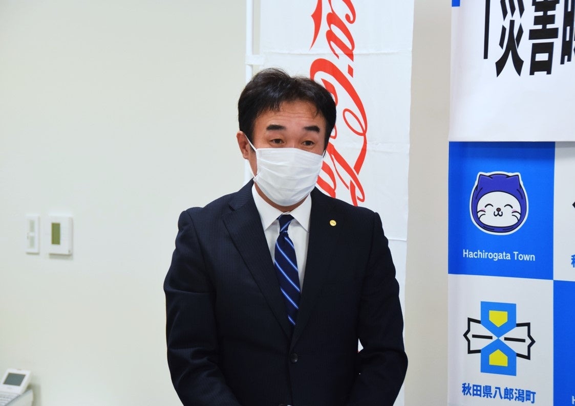 「近年では、毎年のように全国各地で自然災害が発生しております。今年の九州地方での大雨は記憶に新しく、秋田県内においても、8月に隣の三種町、五城目町で河川の氾濫がありました。当町では、今後も必ず災害が来るものと思い、備蓄などの準備を進めております。しかし、想定を超える大規模な災害となると、私たちの力のみでは対応できなくなる恐れがありますので、本日こうして災害協定を締結できることを、町長として大変嬉しく、また心強く思っております。」