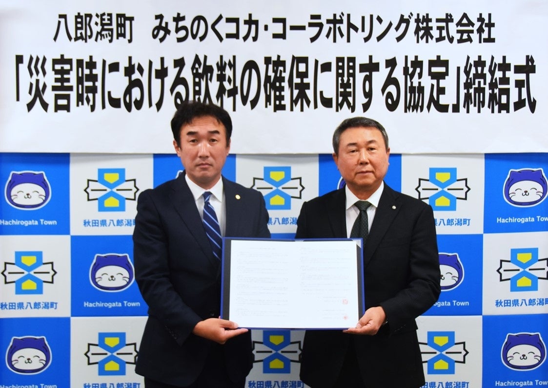 このたび、みちのくコカ・コーラボトリング株式会社(本社: 岩手県盛岡市、代表取締役社長: 谷村 広和)は、秋田県八郎潟町(町長: 畠山 菊夫)との間で、「災害時における飲料の確保に関する協定」を締結することとし、10月14日(金)に締結式を開催いたしました。