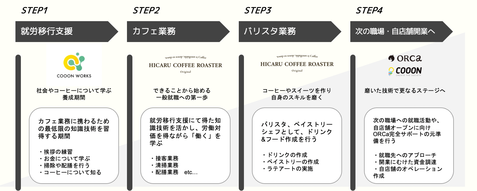 一般就労を目指す一歩手前の取り組みとして、コーヒーに対する座学や接客、ホスピタリティなどを就労移行支援の枠組みの中でCOOON WORKSで学び、HICARUの実店舗でエスプレッソマシーンの操作やスイーツの開発などのより専門的な内容を実践ベースで学びます。2年間でカフェでの就労の基礎ができるようになるまでを全力でサポートします。