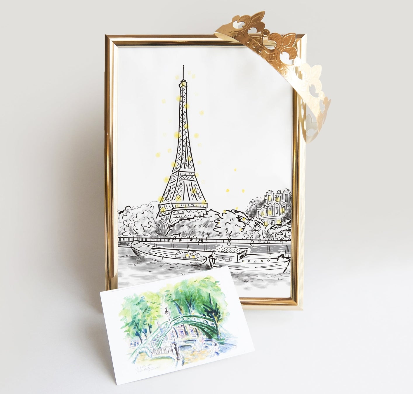 パリをモチーフにした美しいポストカードやフォトフレームは社長の石川芳美が描いたものです。パン職人で実業家の傍ら、アーティストとして創作活動も行なっています。ポストカードはお持ち帰りいただけます。