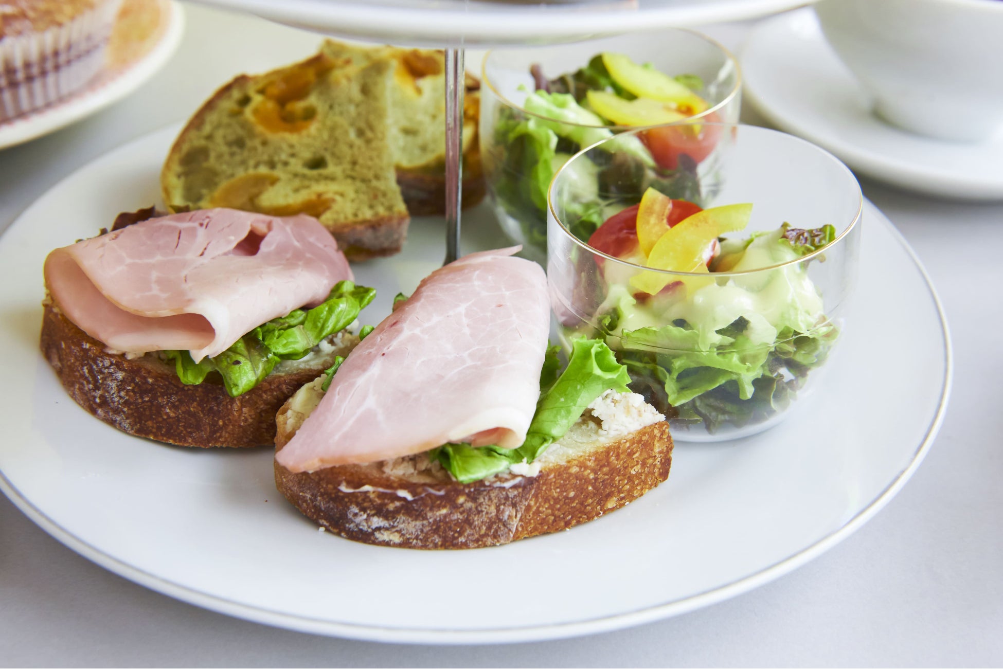 スペシャリテのクロワッサンをはじめ、クグロフ、オープンサンド、サラダ、fève (フェーヴ)が隠れているかもしれない『幸せを呼ぶモンブラン』をご⽤意。インスタフォロワー数8万⼈超え・年間2000⾷のスイーツを⾷べ歩くフードジャーナリスト岩⾕貴美さん監修のアフタヌーンティーです。「Le goûter (ル グテ)-フランスのおやつ-」3,300円(おひとり様/税込)アフタヌーンティーセット、カップ交換制飲み放題