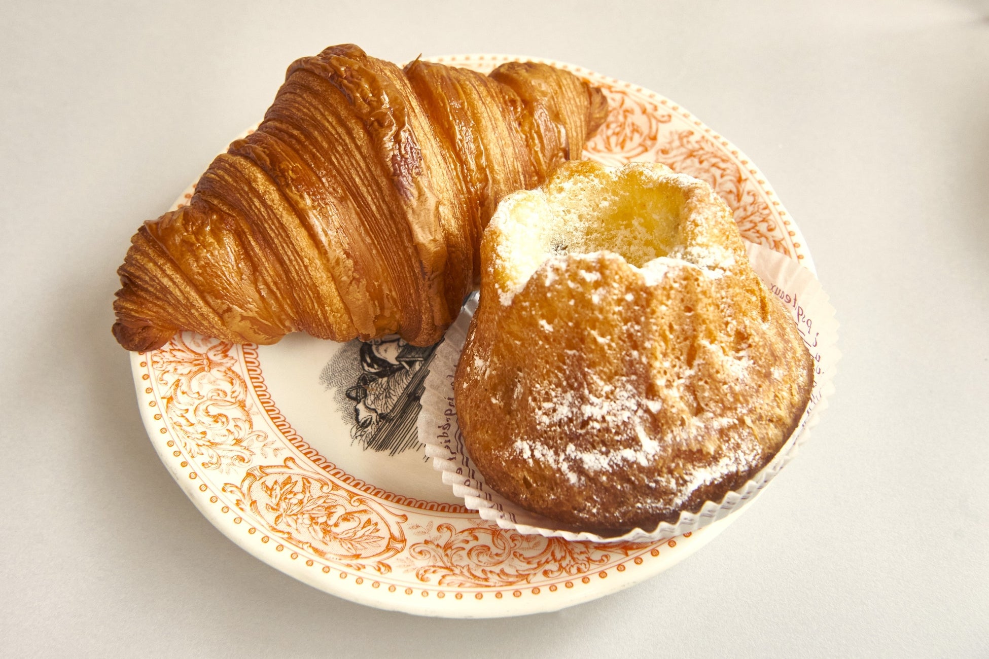 ⽯川芳美⾃ら仕⼊れたフランスGien (ジアン)のお皿には、看板商品のモンテギュバターを使ったクロワッサンフランセやクグロフをご⽤意しました。