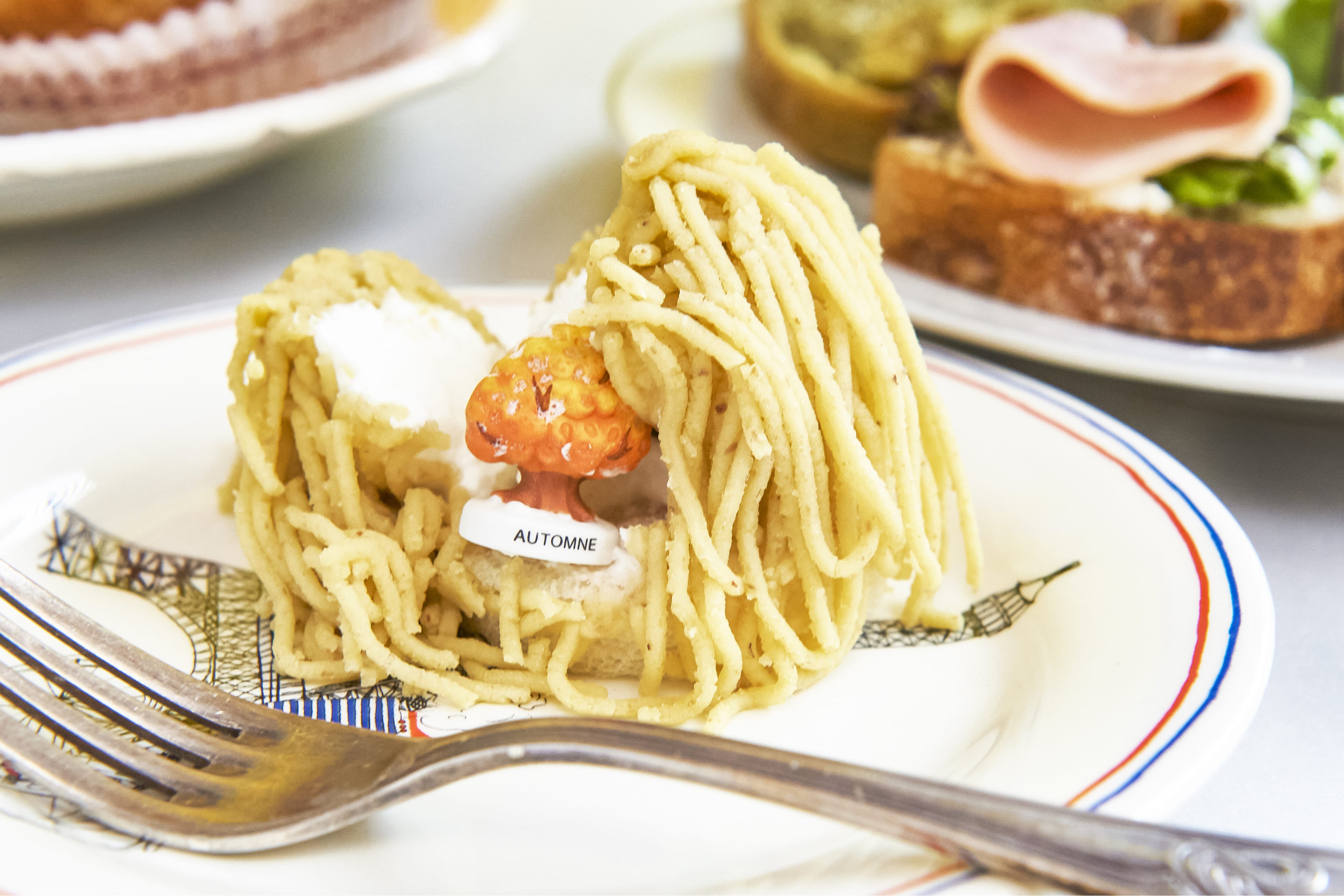 モンブランの⼟台には当店自慢のパンドミ(食パン)、上には無糖の生クリームと栗1粒をのせて、さらに和栗のペーストを贅沢に絞りました。モンブランの中にfève (フェーヴ)が入っていたら、王冠(紙製)とプチギフトをプレゼントいたします。