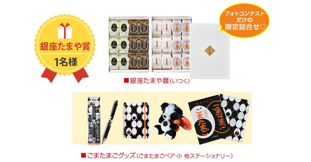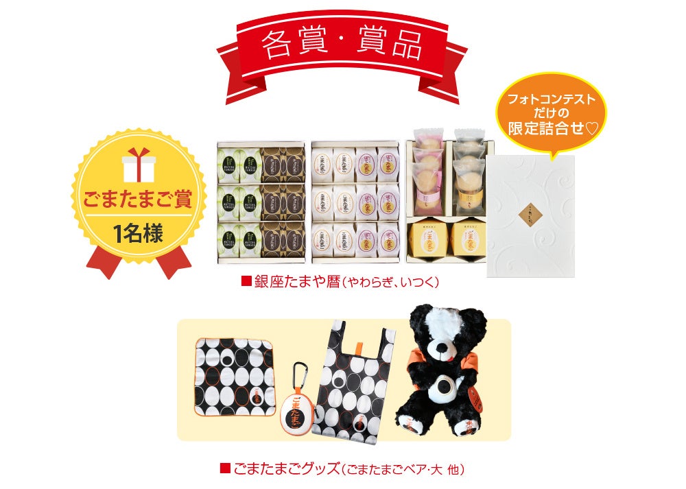 ・ ごまたまご賞:1名様 ごまたまごグッズ(ごまたまごベア(大)&その他グッズ)、銀座たまや暦(東京たまごシリーズ4種・ごまたまごプリン・玉乃子合わせ2種)