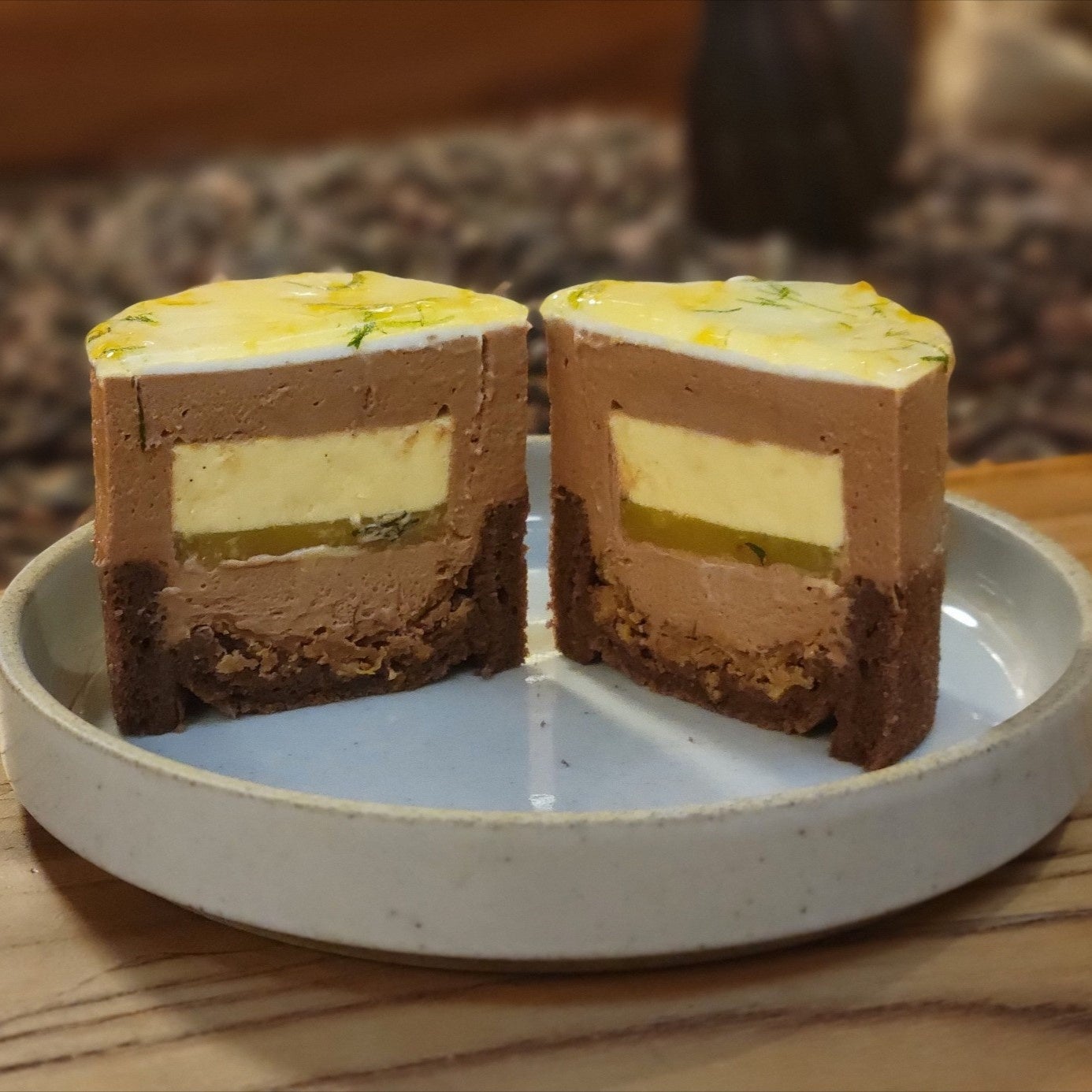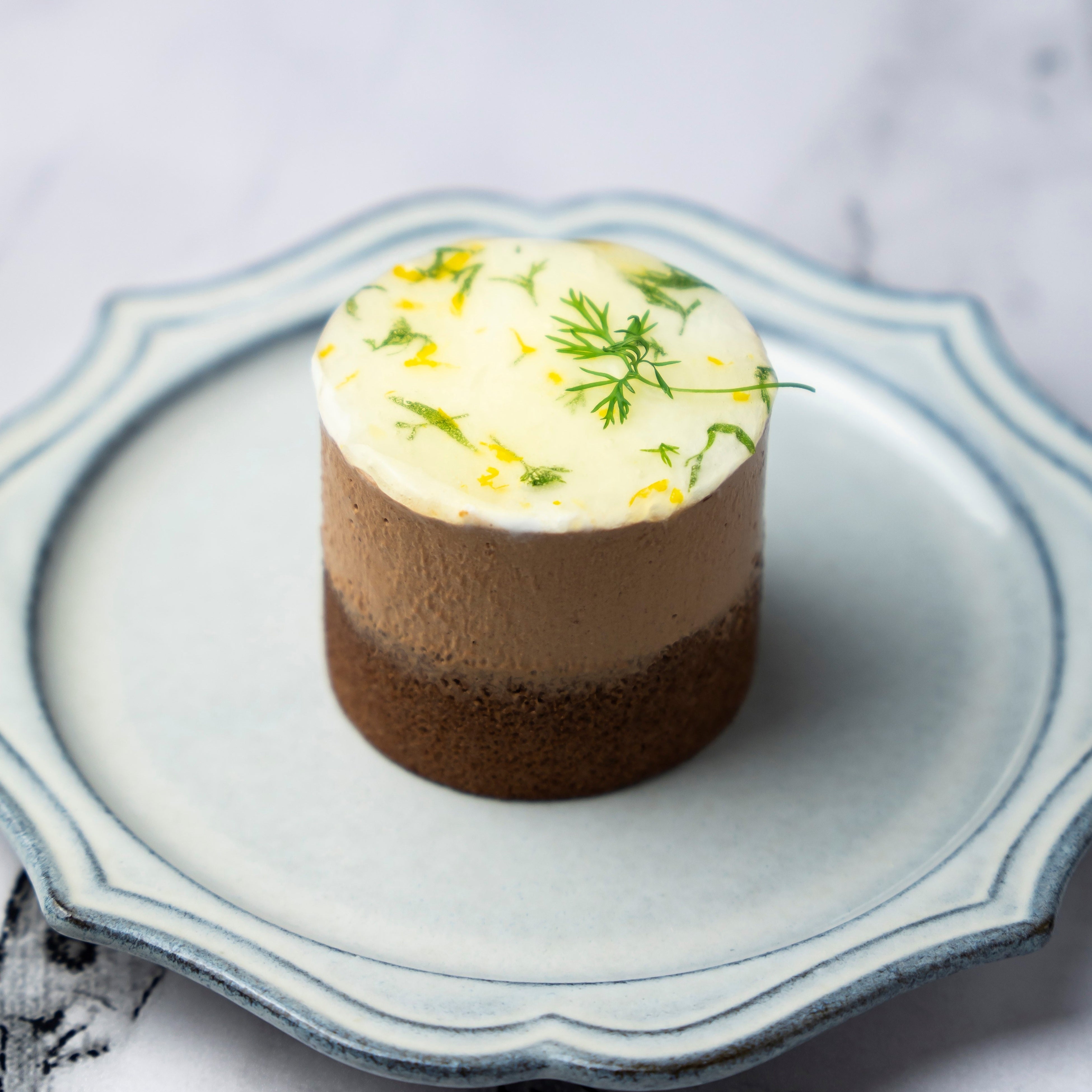 下からチョコレートスポンジ、チョコムース、オレンジピールとディルのナパージュの3層からなり、中に入っているオレンジのジュレとチョコクランチがアクセントになっています。