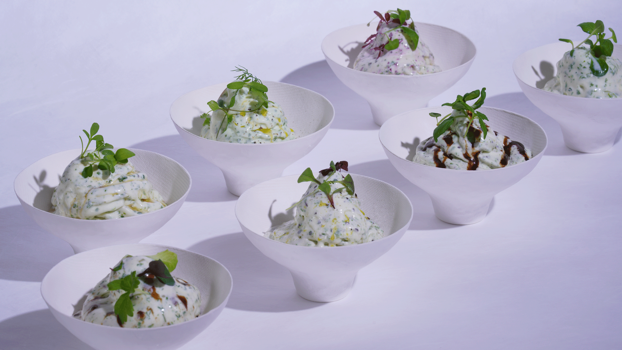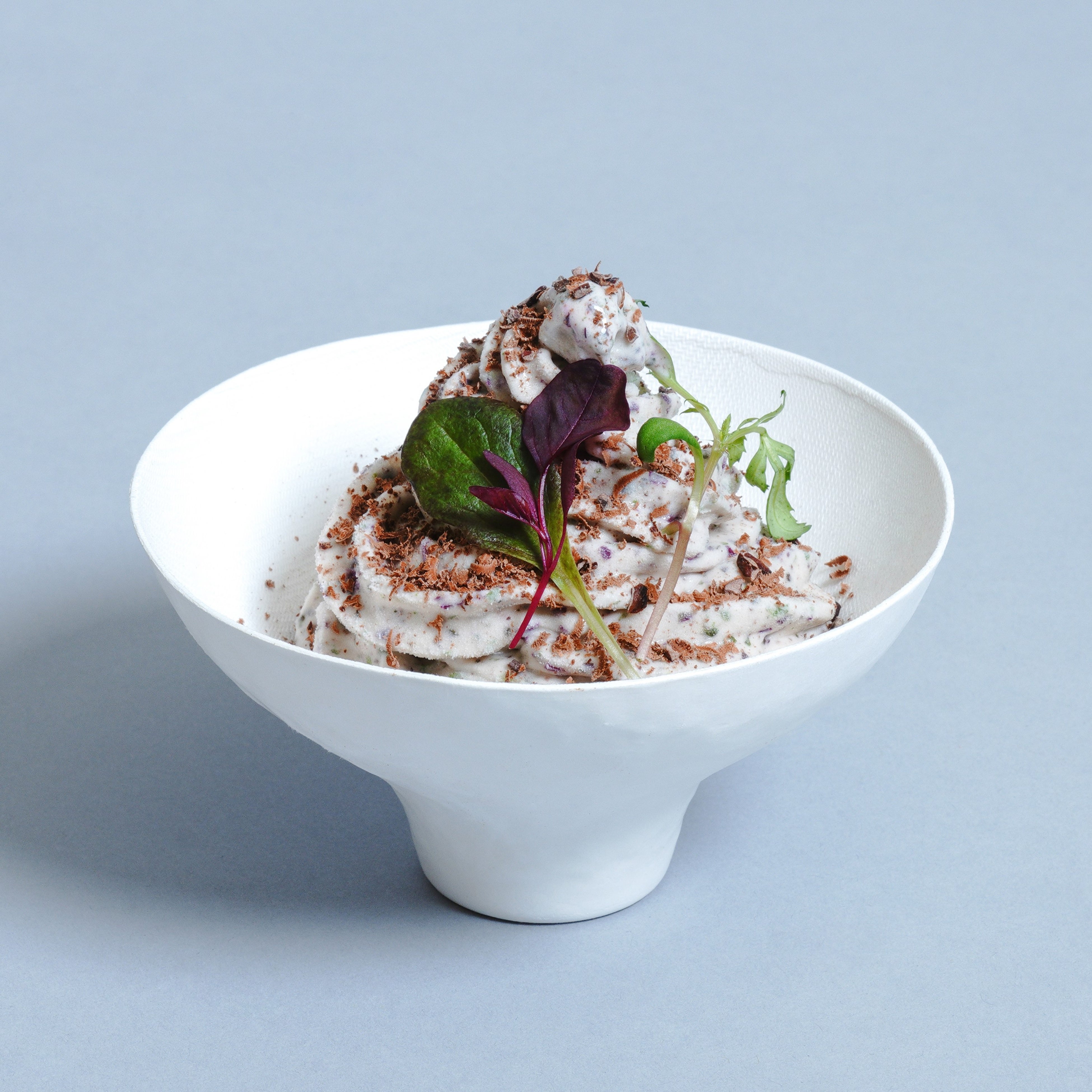 足羽山に吹き上げる、秋の爽やかな風をイメージしました。レタス風味のレッドオーク、ほのかな土の香りのレッドアマランサス、シトラスのような太陽感のある香りのマリーゴールドという3種のマイクログリーンと、オリジナルのバニラアイスに、日和の香り高いチョコレートとカカオニブを組み合わせた一品です。