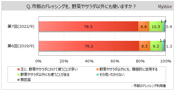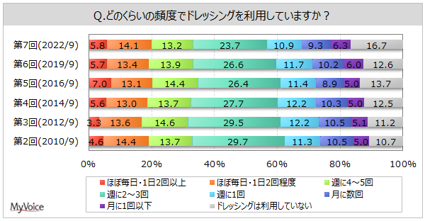 | <今 回>(2022/9)https://myel.myvoice.jp/products/detail.php?product_id=29003 ※上記設問の他に「直近1年間に利用したドレッシングのメーカー」「コロナ禍による利用の変化」も聞いています。 <第6回>(2019/9)https://myel.myvoice.jp/products/detail.php?product_id=25403 <第5回>(2016/9)https://myel.myvoice.jp/products/detail.php?product_id=21804 |