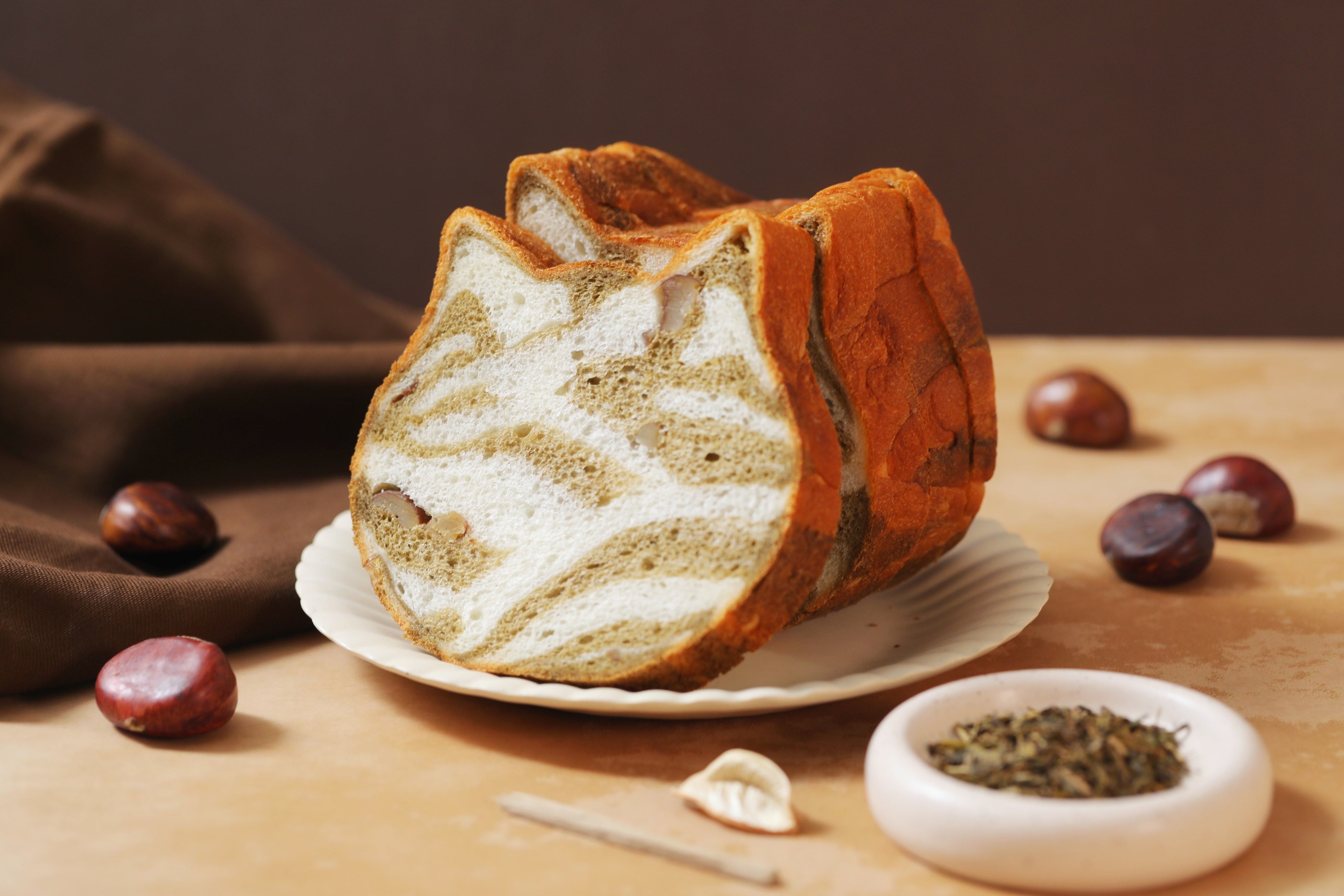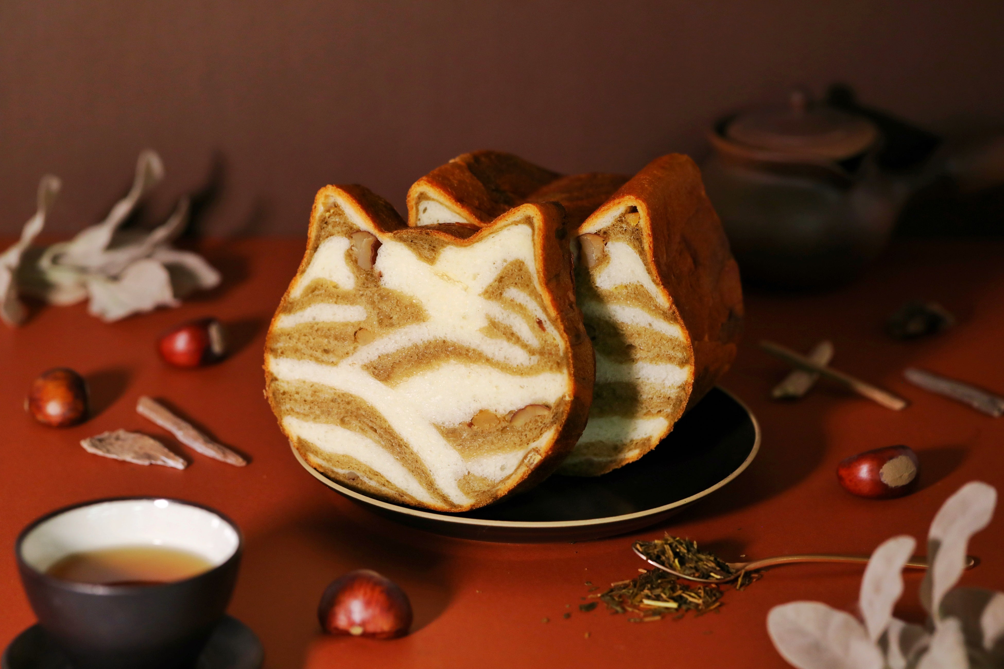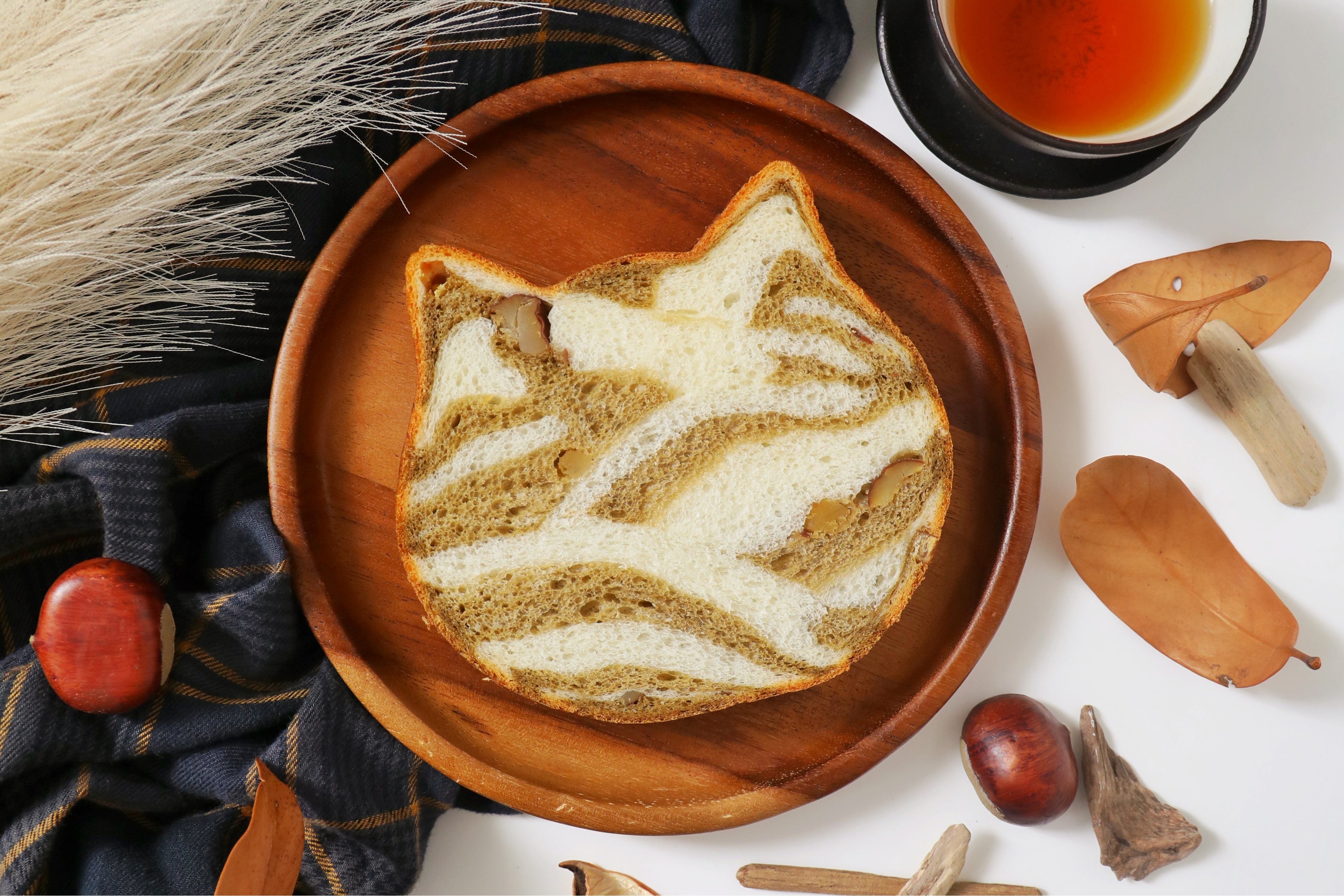 ほうじ茶生地には名古屋の老舗お茶専門店「妙香園」のほうじ茶を使用しており、ほうじ茶の豊かな香りがあたりにふわっと広がります。ねこねこ食パンのミルク100%でミルキーな味わいに、香ばしいほうじ茶の味わいが加わった、まろやかで優しい味わいがご賞味いただけるねこねこ食パンです。また、間に挟んだ渋皮栗のごろっとした食感がアクセントに。少しずつ冬の訪れを感じるこの時期にぴったりな、上品に香るほうじ茶と渋皮栗のハーモニーをお楽しみください。