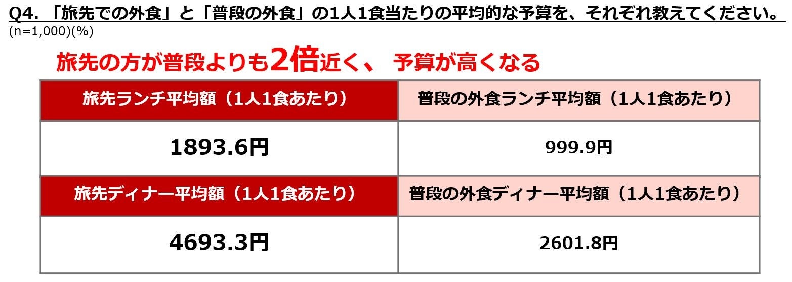 ・「旅先での外食」と「普段の外食」の1人1食当たりの平均予算は、旅先の方が普段の食事よりも2倍近く高くなる傾向。