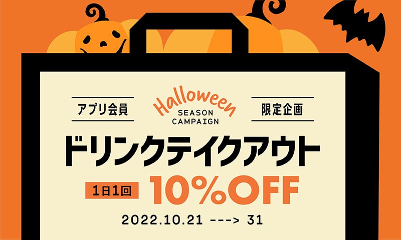 株式会社サンマルクカフェ(本社:岡山県岡山市 代表取締役社長:鎌田 滋之)は、 ドリンクのテイクアウトをより手軽に楽しんで頂けるようハロウィンシーズンの10/21(金)~10/31(月)期間中アプリ会員限定クーポンご利用でドリンクが10%OFFとなるキャンペーンを行います。